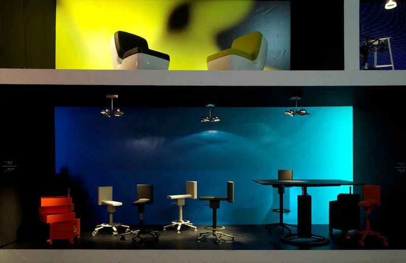 360° is neither a stool nor a chair, but something inbetween. Its name implies that it swivels around and that one can sit on it in all directions. It is meant for seated activities that require a constantly changing posture. 360° is not intended for long stints of work in a static position. Instead it encourages a form of dynamic sitting, short term, ad hoc, improvised – moving around. 360° comes in two types, as a chair on castors and as a high stool. Both versions have a gas piston for height adjustment.