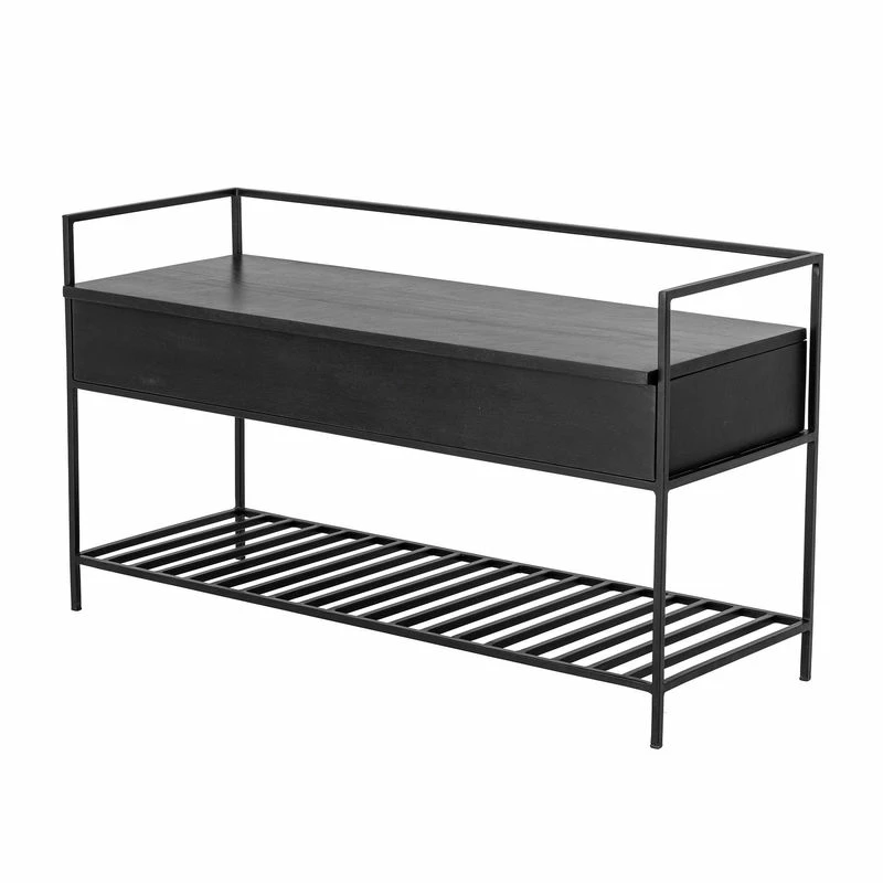 A plain and contemporary look for this practical bench which combines wood and metal. The box hidden under the seat offers a vast storage space. The metallic shelf lets you store shoes, boxes and baskets. Perfect in an entrance to do your laces, the Abelone bench fits all over the house: a bathroom (you can store towels in it), the bedroom, the dressing room, etc. Add some cushions to it to improve the comfort and boost the style. Abelone can also serve as a low console in a lounge.