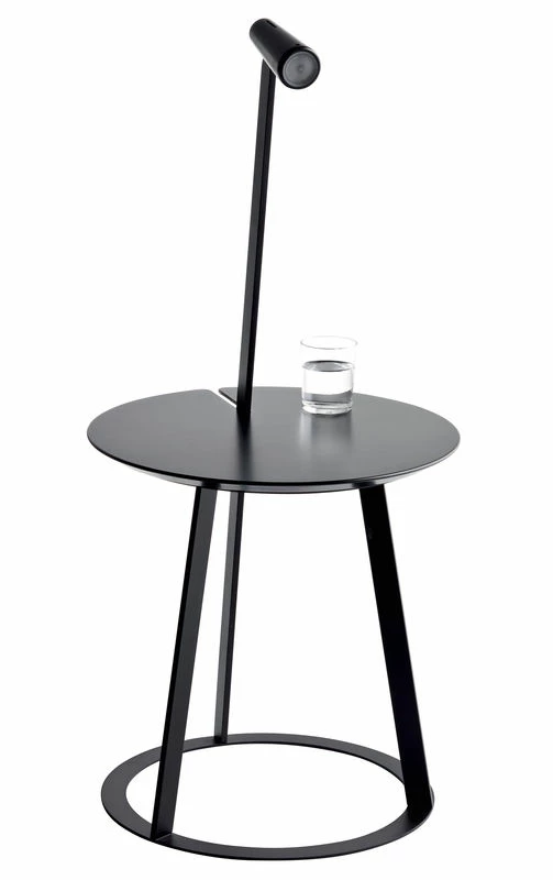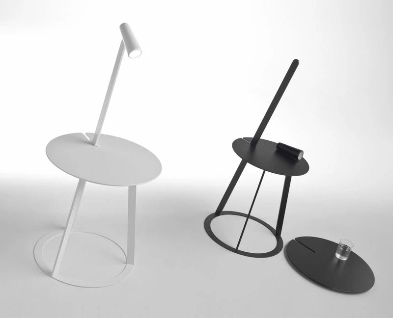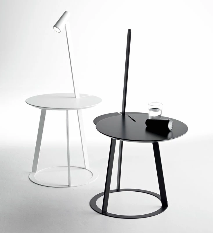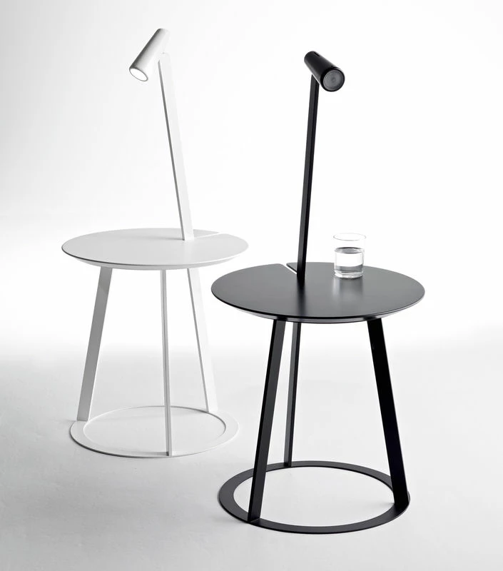 Small table with chrome or painted steel structure, shelf in enamelled or veneered MDF. LED light with rechargeable batteries or a direct power supply.