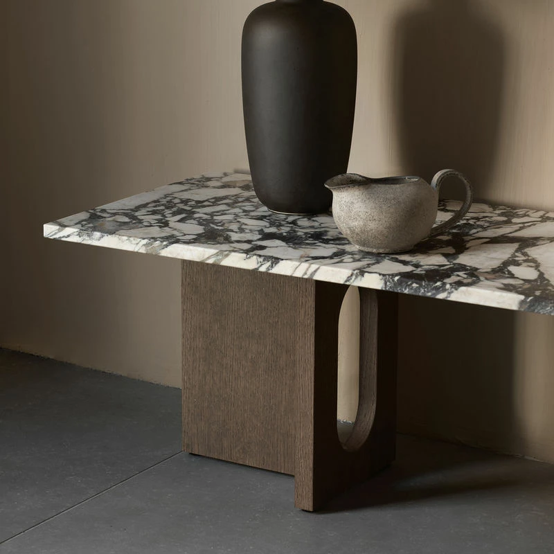 The Androgyne table is the creation of Norwegian architect and designer Danielle Siggerud. This table was originally designed to furnish the café space of the Menu showroom, which could be found in the “The Audio” hotel in Copenhagen. The Androgyne table collection presents simple silhouettes combined with elegant materials. Celebrating craftsmanship and wood, the Androgyne table is available with a walnut, stained oak or natural oak base and tabletops in wood, Kunis Breccia stone or Calcatta Viola marble. This table is also available in stones made entirely of stone or marble. The Kunis Breccia sand-coloured stone is a limestone which resembles marble and which stands out with its various tones of beige and brown, subtly intertwined. The classic and noble look of the materials combines wonderfully with the modern and graphic style of the base. This open structure is constituted of inter-crossed panels. The flat shapes and the central opening play with our perception of the volumes, offering an amusing interplay of perspective. This coffee table will go equally as well in very modern and more traditional interiors.