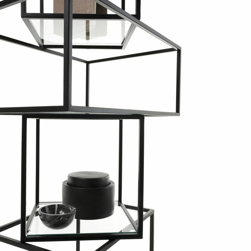 With the Babylon shelf, Italian designer Emanuele Magini delivers a skillful exercise in full and empty. It consists of six boxes of various sizes stacked to form an unstructured column: a wonderful asymmetric assembly, a succession of flowing spaces. The transparent glass shelves are nested in a thin black metal structure that emphasises and magnifies the contours of the evanescent silhouette. The boxes are open on all four sides. This open structure plays with volumes and light, bringing a surprising depth to your space. Aesthetic and functional on all sides, Babylon can be placed in the middle of a room. It displays your books and favourite objects in a very graphic manner.