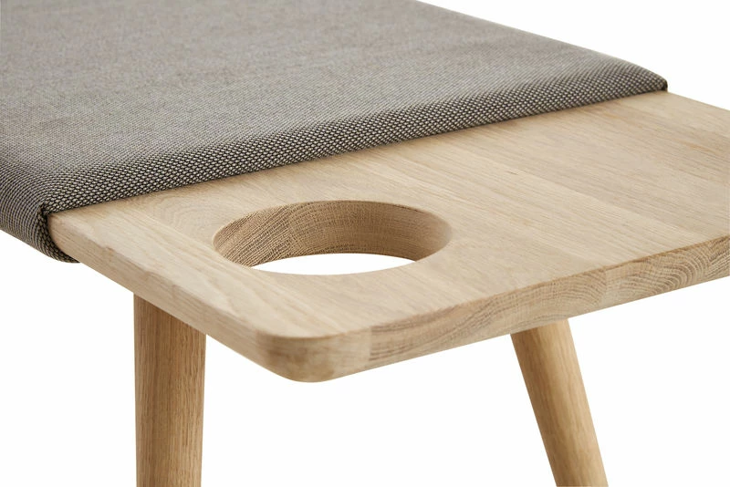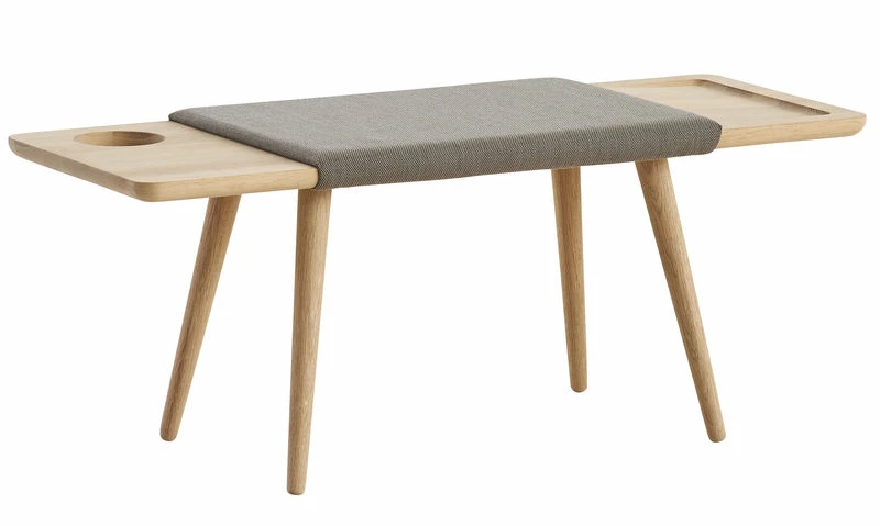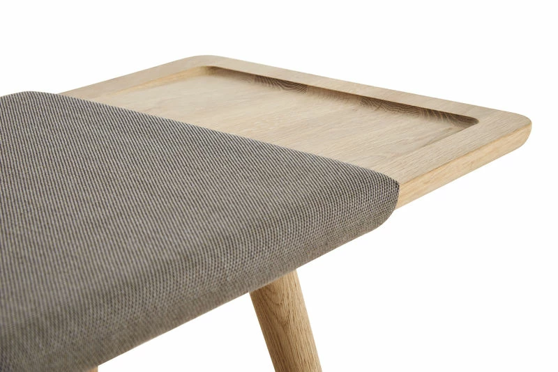 This multifunctional bench is made of clean minimalistic lines inspired by the Nordic traditions. The bench is made of solid oak, with a focus on the unique veins that bring nature inside and give each unit a very special and distinctive look. By adding the bench a shelf and a seat, it can be used in multiple contexts. Inspired by an old spool of cardboard the overall shape of the bench is defined. Based on this inspiration the middle piece has been upholstered to also provide increased comfort. The fabric is carefully selected to complement the structure and shades of the wood. Made in solid oak with Gabriel fabric.