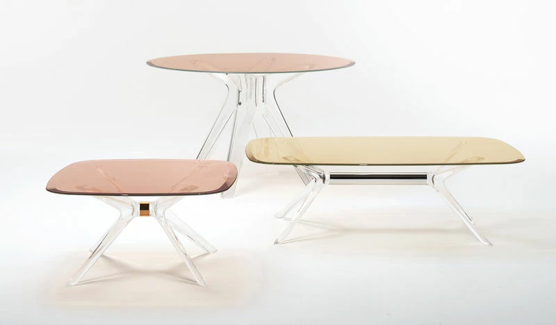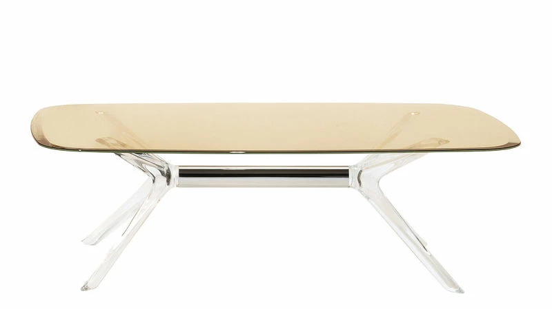 A sculptural masterpiece, a fascinating and timeless coffee table signed by Philippe Starck. The fruit of a high tech manufacturing process, the polycarbonate base is made in a highly innovative mould that enables extreme durability with minimal materials. The base is ethereal with four tapered branches, and is strong enough to hold the glass top perfectly stable. The base is set with a central chrome bronze ring, like a precious jewel. Blast is a tribute to lightness and formal purity. It reflects Starck’s obsession with creating maximum effect with minimal material, embodied in the transparent polycarbonate base. The bevelled edges of the glass top is available in soft and translucent colours, which show off the beautiful base. This is a timeless coffee table that will fit in well in any decor – evanescent and discreet but with a strong character. Philippe Starck about Blast: “A coffee table that does not need to be decorated with a book, since it is already a work of art.”