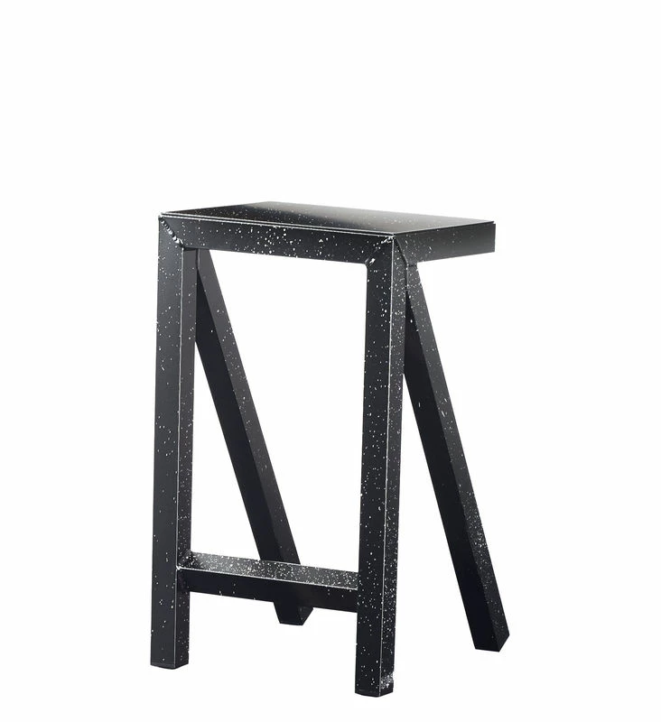 “Created by designer Jerszy Seymour, the Bureaurama collection features high stools and light and ultra-graphic bar tables. Available in a variety of sizes, they can be mixed and moved at will to create user-friendly relaxation areas or ergonomic workspaces. The Bureaurama high stool is made of aluminium, its welds visible for a deliberately raw look. On a black background, dots of white paint have been applied by hand, making each piece unique. These splashes of white remind us of clusters of stars within the galaxy, creating an impression of infinity for all who view them. The base consists of two straight feet and two compass feet: they draw clean, airy, easily legible lines. Compatible with outdoor use, you can use this high stool on your terrace or in your garden. Jerszy Seymour: “This collection is designed as a place to reconsider our future, discuss and make informed decisions, or simply to scribble, have fun, and enjoy ourselves.”