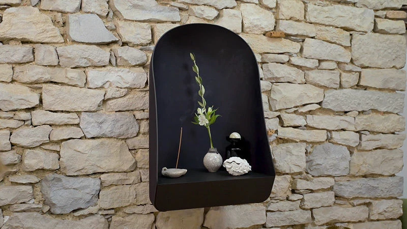Born from a collaboration with French design studio Chape&Mache, Chaperon is a wall alcove inspired by the votive niche, originally designed for showcasing the statue of a saint in religious art. This shape, with deep roots in Western culture, brings out a sense of sacredness in both the object and the space housing it. Chaperon has been designed with a view to staging your own mysterious and mystical universe. Dressed with precious, everyday objects, the Chaperon wall console highlights the value of the macrocosm it adorns by drawing the eye in. Upholstered in fabric, the hollow structure evokes a protective veil, surrounding and showcasing whatever you place inside. In the lower section, the built-in drawer is concealed in the rounded shape and reflects the fine cutting techniques of the Ibride studios. With the same aim of reducing its environmental impact, designer duo Aurélie Chapelle and David Machado work hand-in-hand with ibride to create with a 100% Made in France process, opting for short supply chains. The shell, an innovation in shaped fabric, is thermo-formed and OEKO-TEX certified. The interior surface and drawer are made in Fenix, an anti-scratch opaque material, Chaperon can be worked into several spaces: hallway, bedroom, living room, etc.