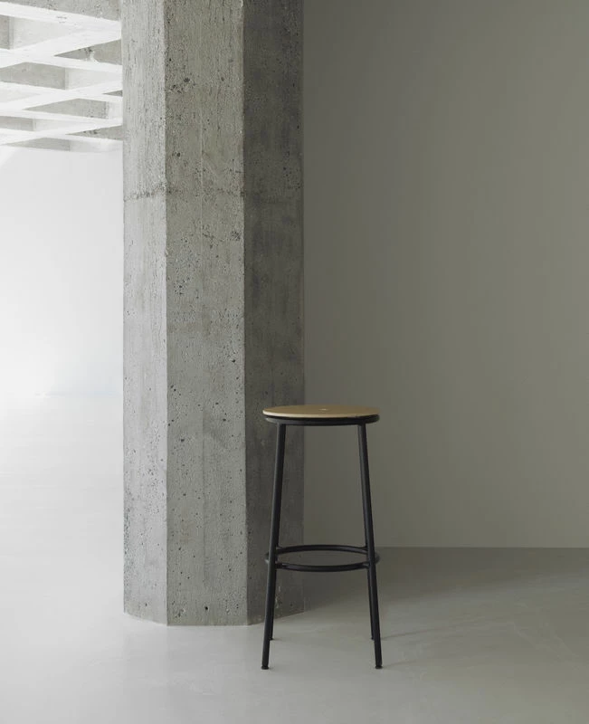 The Circa stool is a minimalistic and timeless stool consisting in a robust tubular steel structure and an oak veneer or aluminium seat. With extreme finesse, the circular seat is slightly raised from the base, giving the piece an airy, lightweight silhouette. Very robust, Circa has been designed to withstand the tests of time. As its name suggests, circles are a recurrent element in the design concepts of the Circa stools. The distinctive circular shape of the seat is repeated in the rounded footrest, as well as is in the hole in the middle of the seat which makes the stool easy to carry. The use of repetition provides a harmonious and well-balanced expression across the design. The Circa stool series responds to any need for simplicity and functionality in modern interiors, and offers a perfect solution for seating in residential or commercial spaces. The Circa tall stool is perfect around a bar or a kitchen island…