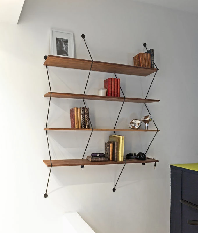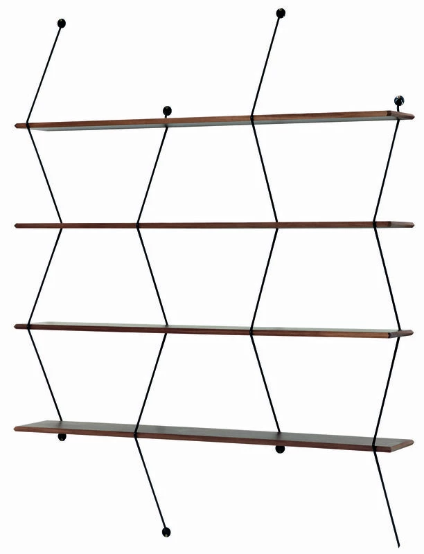 This large wall shelving unit embraces the wired trend with angular and asymmetric lines. With its very graphic zigzag uprights, Climb awakens your curiosity. The design of Climb plays on the feeling of tension from the metal wires which hold the solid wood planks, which becomes structural themselves. The finish is perfect: the wooden planks are bevelled all along their edges. Climb is made up of 4 shelves (L 135 cm) inserted into 5 metal wire uprights. This bookcase is very easy to assemble and take apart: the shelves simply insert into the uprights, with no screws or glue.