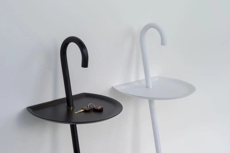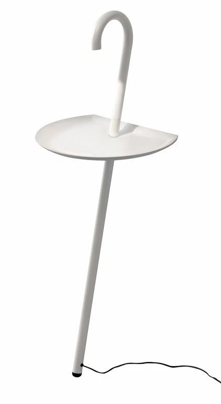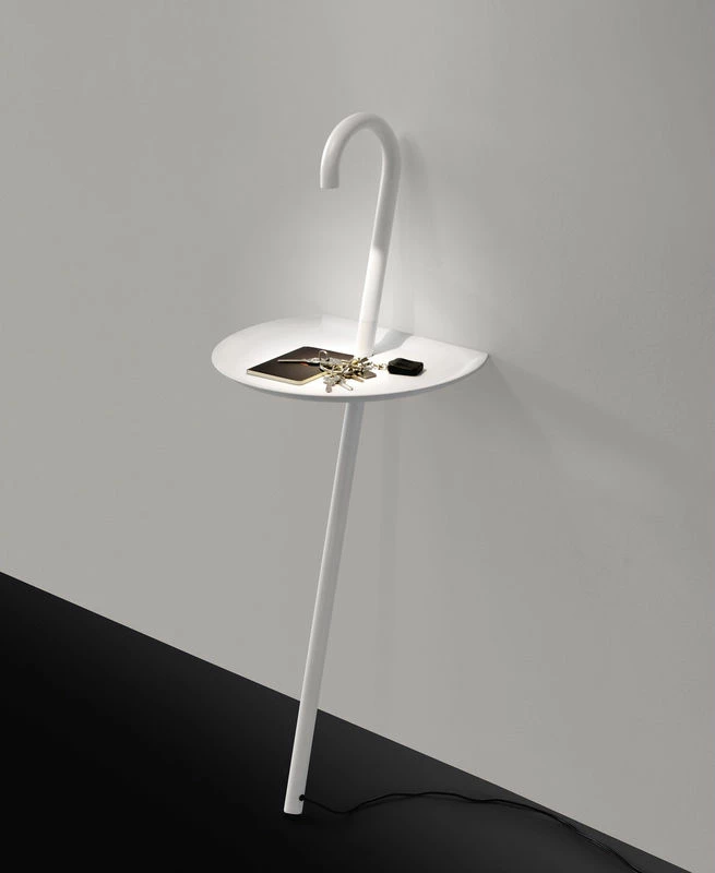 Hybrid object, Clochard is a rod-shaped lamp (H 98 cm) equipped with a pocket tablet scheduled to lean against the wall. This playful lamp mixes genres and breaks down the barriers between different families of everyday objects. Designed painted metal and equipped with an LED that illuminates the empty pocket tray for easy reference to his business. The connection is made with the integrated power cable to the foot of the cane.