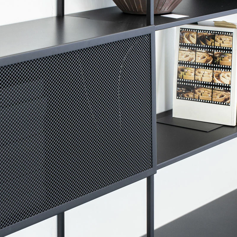 This steel box is designed to be placed on the shelves of the Easy Irony bookcase from Zeus (bookcase sold separately). The pull-down door is made with steel mesh. This openwork, light and elegant texture plays with transparency. Depending on the observer’s point of view, the metal mesh lets light and looks through, or on the contrary, prevents it. The door has a magnetic closing system. Thanks to its perfectly designed dimensions, it simply slides onto the shelves : you can place it freely and change its position as you like. Of course, you can use this storage box wherever you want: on any shelf or piece of furniture, in the kitchen, living room or bedroom ! You can use just one box or assemble several together. PLEASE NOTE. The price is the amount you pay for the storage box only: the Easy Irony bookcase is sold separately.