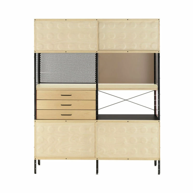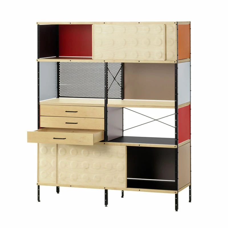 Treat yourself to an ORIGINAL iconic piece by Vitra. An original will always hold its value. It will stay with you for your whole life and outlast you, to be passed on to the next generation. Swiss design house Vitra is the only company authorised to manufacture Charles & Ray Eames products for Europe: if you own an Eames product manufactured by Vitra, you can be sure it’s an original. Charles and Ray Eames are two of the most important designers of the 20th century. It was in 1949 that Charles and Ray Eames developed their innovative desk and shelving system, called the Eames Desk Unit (EDU) and Eames Storage Unit (ESU) respectively, inspired by the same aesthetic as the iconic Eames House. Nestled on the heights of Los Angeles, the home of the famous couple of designers mixes natural wood and black metal. It is recognisable by its facades brought to life by panels of primary colours, which give it the air of a Mondrian painting. Much like the Eames House, built at the same time, the ESU shelving units and EDU desk were designed according to the principles of industrial series production. The ESU multifunctional shelving system combines natural birch veneer shelving with black lacquered steel structures. Colourful aluminium panels punctuate the spaces, adding rhythm and a playful dimension. The ESU bookcase consists of four levels, offering plenty of storage space. It has three drawers, two levels closed by sliding doors and three open boxes. The four levels of shelves correspond to the standard height of files.? In collaboration with the Eames Office, Dutch designer Hella Jongerius gave the ESU shelves a new lease of life by revising their chromatic range. A new assortment of colours has been carefully defined to bring a touch of freshness and modernity to the ESU shelves, while retaining the vintage spirit of 1949 and 1950.? The ESU Shelf system is available in several heights, from the low sideboard to the tall bookcase.