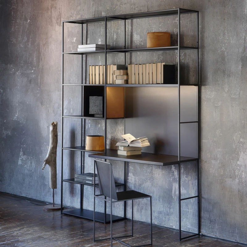 Highly graphic, this metal Easy Irony bookcase features 10 shelves and a desk surface (D 55 cm). It’ll let you organise and make the most of your workspace. Its can be assembled very easily, with no screw or tools… This bookcase can easily be assembled and disassembled (wall closing required). A wonderful assembly that combines ingeniousness, visual lightness and elegance. Zeus furniture is made by skilled craftsmen in Italy, near Modena. Each piece is made by hand: the metal is cut, assembled, welded and painted by hand. Each item is unique. Steel is a recyclable material and any metal scrap not used during manufacturing is recycled for re-use. Zeus furniture is built to last: highly durable, this furniture can be handed down from generation to generation.