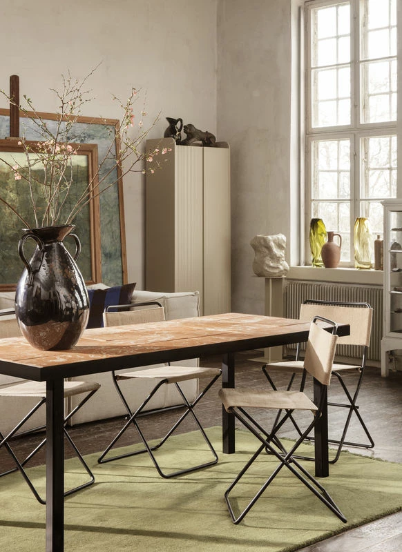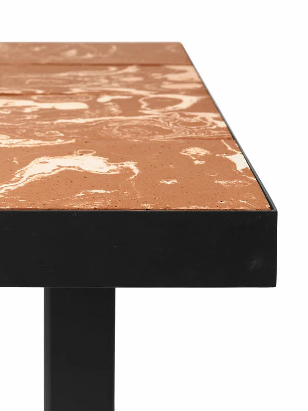 A fusion between past and future… A hybrid style for this steel table whose top is inlaid with a superb mosaic of clay tiles, a material with a warm, natural texture. These tiles are hand-crafted in Italy using centuries-old manufacturing techniques, using the finest Po clay. Very hard-wearing, they’re not afraid of water: Flod Tiles tables can be used both indoors and out. The tiles are simply laid in the steel frame without joints (they’re not sealed): this allows rainwater to flow through the perforated frame. The clay is slightly rough and coarse, with colour variations: these characteristics deliver an authentic, natural aesthetic. Imperfect shapes and irregular workmanship showcase its craftsmanship and hand-made nature. The raw appearance of the material contrasts with the modern style of the sleek black steel structure. Flod Tiles tables have the retro charm of antique furniture found in flea markets. Like those pieces of furniture that have lived a life and have a story to tell, the Flod Tiles collection brings a warm, authentic note to your decor.