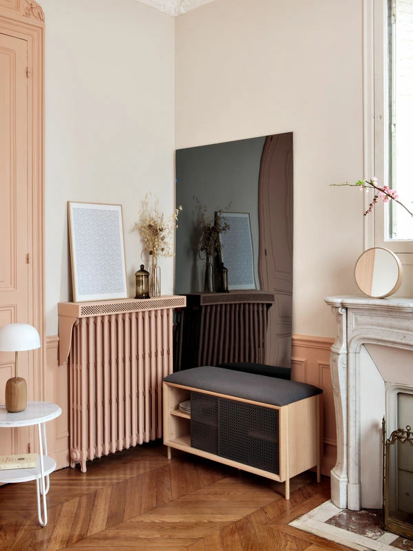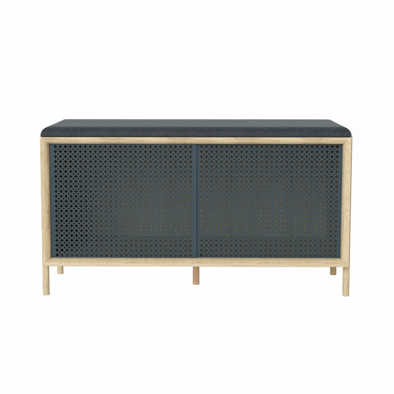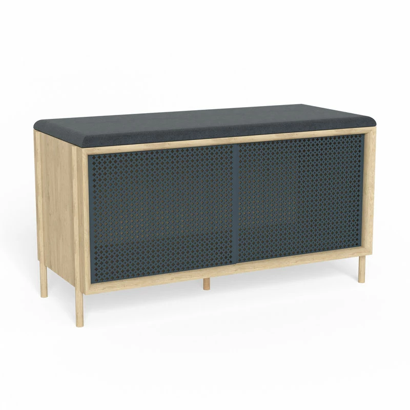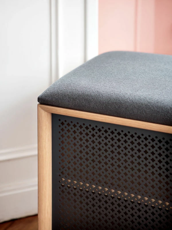 An inspired mix between retro style and contemporary details for this bench dresser which reinterprets the art of wickerwork… Gabin combines pale wood with colourful metal. The oak block includes two perforated metal sliding doors with a pattern inspired by wickerwork. Close up, the micro-perforations create a graphic, delicate and aerial effect. Further away, it creates a surprising optical effect, ethereal and vibrating! Inside the unit are two compartments with a shelf. The Gabin bench dresser is perfect in an entrance: you can place your bag on it, sit down and store your shoes in it.