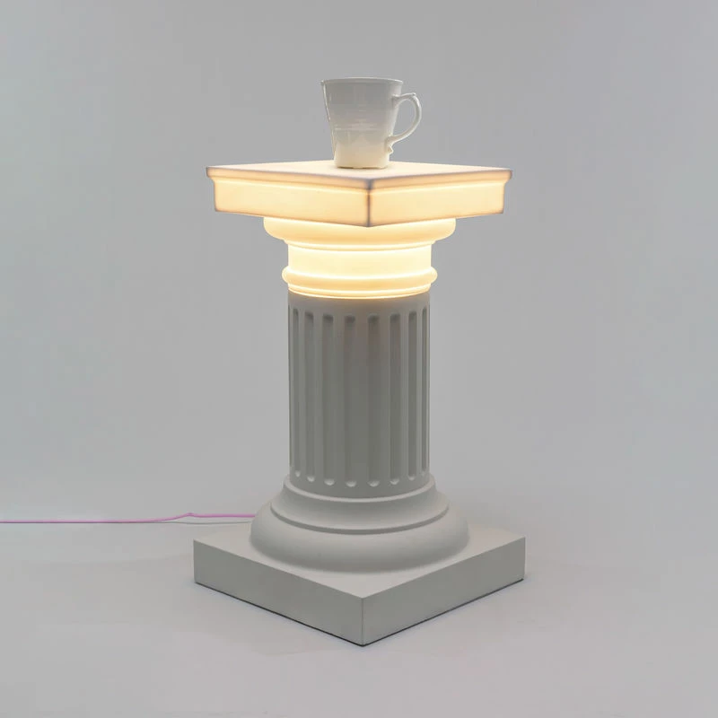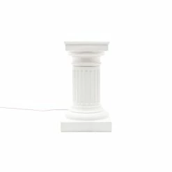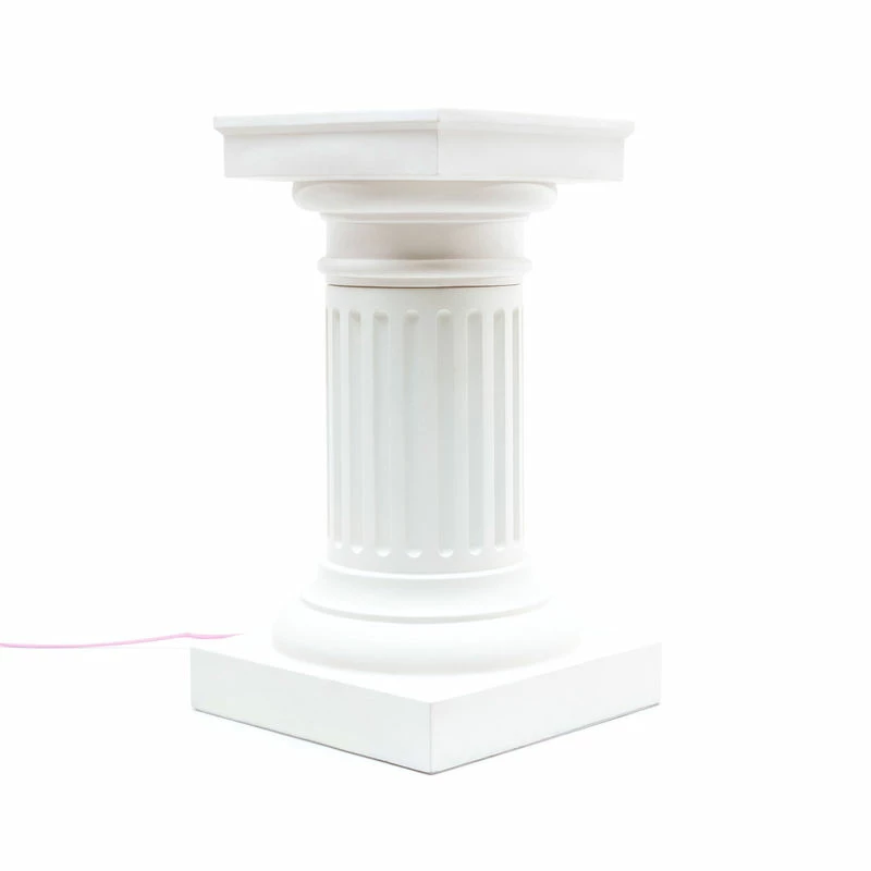 New Antic! Antiquity has continuously inspired modern artists. With “Las Vegas”, Italian designer Fabio Novembre dusts off Antiquity by ironically revisiting the columns of classical architecture to playfully transform them into lamps. The designer has taken fragments from classical antiquity and allowed them to speak with the present. The base of the lamp is made of fibreglass: a material that perfectly imitates marble. Made of white porcelain, the upper part of the column serves as a diffuser. The translucent porcelain lets a warm, inviting light filter through. These columns are available in two heights (H 50 and H 190 cm): in the low version, the column also serves as a side table. The stylish detail: the pink cable which adds an offbeat touch. Fabio Novembre’s creations are rooted in memory and collective imagination: these reduced-scale architectural pieces contain fragments of the past, and are full of enigmas and aesthetic suggestions… Displaying its timeless wisdom, this sublime architectural fragment inspires fascination through its grace and mystery. This sculptural lamp, at the boundary between art and design, creates a dreamlike, extravagant world, at once provocative, funny and absurd. Las Vegas is exhibited in our interiors to decorate as much as to illuminate. Fabio Novembre: “In all the spaces I’ve designed, I’ve always tried to integrate the pillars by transforming them from structural elements into communicative totems, just like the classic columns in which the decorative part was a cultural statement. “Las Vegas” is the postmodernist evolution of this attitude. It’s a fragment of memory that brings light to the darkness of oblivion.”