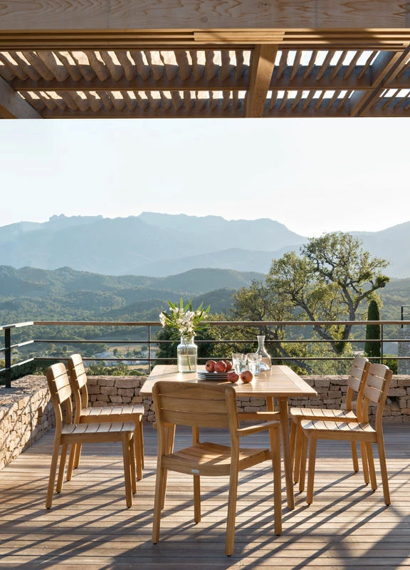 Unique and timeless items, in a 100% teak atmosphere… With its plain shapes and its warm curves, the Lodge collection embodies all the authenticity of the Vlaemynck brand. The range stands out due to its simplicity and its comfort: the table, chair and armchair invite you to savour the sweetness of the moment. The raw teak selected is of an exceptional quality, with its thickness superior to the market standards, as well as its natural resistance to poor weather. The teak (not oiled) develops a natural patina over time: it therefore offers shades of browns and greys for a gentle and very modern appeal. You can also carry out a light sanding at the start of each season to get back the original hue. This luxurious furniture with perfect finishes is very resistant to poor weather and UV. The chic and timeless style of the Lodge collection fits in to numerous environments. For over 50 years, the French manufacturer, Vlaemynck, has been fitting out the exteriors of the most luxury establishments: the Carlton and the Martinez in Cannes, the terrace of Park Hyatt Paris-Vendôme Palace, etc. Made in France (Burgundy), this high-end outdoor furniture has exceptional quality and robustness.
