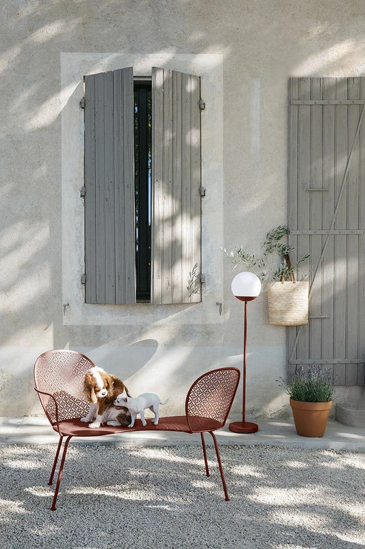 The Lorette bench is a furnishing element that boasts a huge personality and which is a wonderful addition to the collection of the same name, which is already full of incredible pieces! Positioned on your terrace or even tucked away in the garden of your country house, this bench is the perfect spot for whispering sweet nothings to your other half. You’re sure to spend many relaxing hours captivated by the play of shadow and light projected onto the ground, created by the floral pattern. This bench seat, inspired by loveseats – famous armchairs with two facing seats – no need to strain your neck while trying to enjoy a conversation: clever! Its look fits in perfectly with the neo-romantic style of the collection, capturing hearts and minds. Created by Frédéric Sofia, the Lorette range features a singular, subtle motif that, like a monogram, becomes a real signature… A flower with four petals, representing an opening up to the world. An openwork patter which embodies our country homes with poetic ambiance. Design from the 1950s/1960s is also evoked, with slender lines and rounded corners. Its influences? Numerous. It’s personality? Strong. The delicate perforated pattern is inspired by moucharabiya style, demonstrating the extent of Fermob’s expertise in metalwork. Made by artisans in Thoissey, the Lorette bench also stands out with its asymmetry: an armchair on one side, and a chair on the other! Original in every way… The elegance of its design and the technicality of its design don’t detriment the sturdiness of our bench, which is ready to take on any weather condition and the strongest sun rays thanks to the UV-resistance of its polyester powder paint coating.