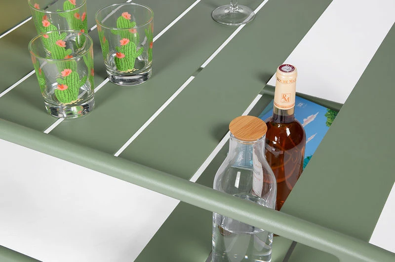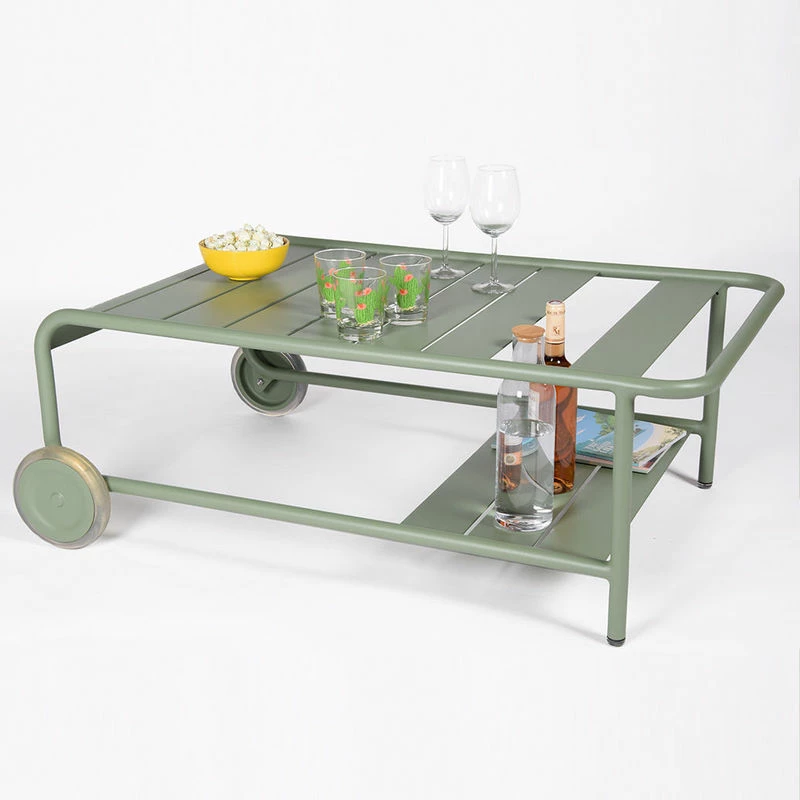 At Fermob, your wish is our command with this low metal table from the iconic Luxembourg range, which we know you will fall in love with! Or will this be the first time you treat yourself to a piece of furniture which is synonymous with the French art de vivre? Frédéric Sofia has designed this quirky low table with wheels in his signature style to be the perfect piece for your outdoor needs. In the mood for a delicious lunch in the shade of the olive trees? Fancy an aperitif by the pool? Dinner on your patio overlooking the sea? Easy to move around thanks to its wheels and handle, this table is perfect whatever the occasion! Its lower shelf makes it ideal if you’re looking for somewhere to leave bottles, jugs, plants and magazines. This designer low table is incredibly solid and is also weather- proof and UV-resistant, making it the perfect choice for fans of fun and bright furniture. That’s no surprise! It’s been lovingly created Fermob’s experts with a real attention to detail… ready for you to welcome the iconic Luxembourg collection into your garden or patio! And so that your stunning low table with wheels does not get lonely, why not fall for some lounge chairs or armchairs from the same collection? Just like the table, they come in the 24 shades available in Fermob’s colour chart! For that guaranteed wow effect and a gorgeous outdoor living space!
