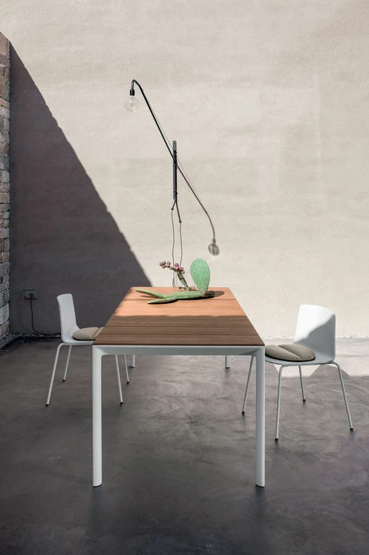This large table with its clean lines promises great times together with family or friends … Sober and elegant, its structure and feet are made of white lacquered aluminium, with a base notable for its rounded, soft shapes. The Maki table top is made of teak, a naturally resistant material that’s FSC-certified. Teak can take on a natural patina over time to display a silver colour. If you want to keep its natural shade, we recommend you treat it with oil. This Maki table offers an ultra-chic alliance of metal and wood. Its lacquered white feet blend perfectly with the natural teak and bring a chic and contemporary touch. This table also comes in other colours, dimensions and depths. Please contact our personal shopper for more information.
