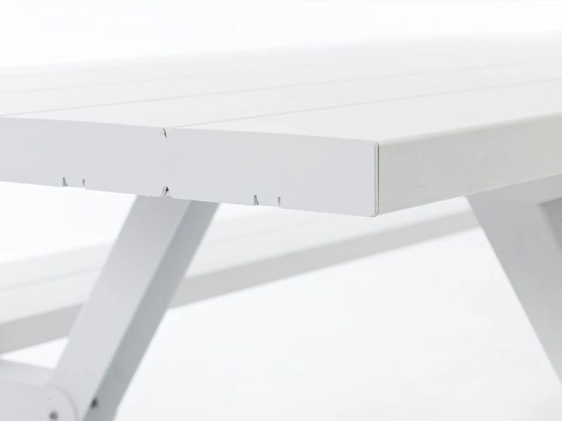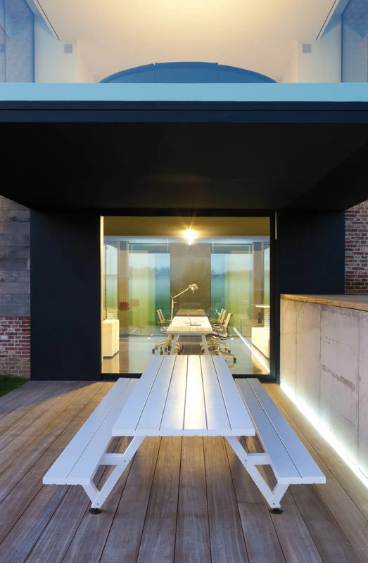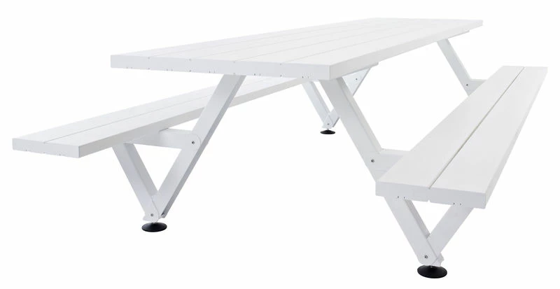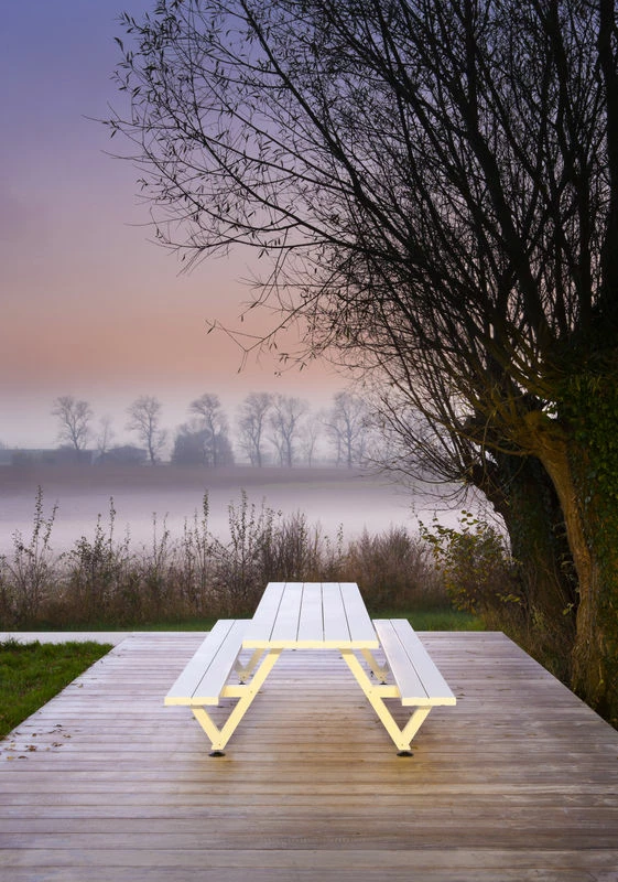 Marina is a picnic table in its most basic shape and made out of pultrusion fibre glass profiles. This way, seemingly endless tables can be created. The composite of fibre glass and polyester is a solid, durable and contemporary material that feels just like wood. However, it is considerably less sensitive to temperature changes and humidity.