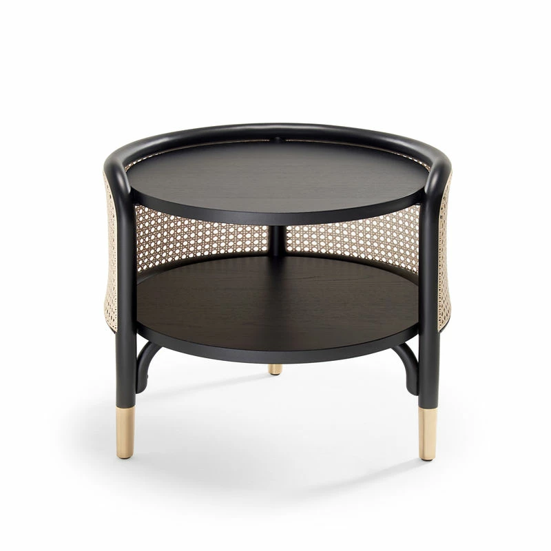 Exuding a retro charm with an Art Deco feel, the Mos side table was designed in 2020 by the famous Italo-Danish Gamfratesi studio. This is a creation that breathes great modernity, combined with the timeless elegance of the first items of bentwood furniture that appeared in the late 19th century. The Mos side table has a lower shelf which offers extra storage space. This side table stands out with its incredibly decorated and curved panels in straw caning, adding to its strong personality. This panel delicately surrounds the two shelves, partially covering its contents. The structure in black lacquered solid beech is finished with gilded brass feet, giving this bench a refined aspect. Thanks to its lightweight elegance, the Mos bench can be integrated into any space: next to a sofa or a bed. Rich materials, high standards of quality, exceptional finishes and an original form, all wonderfully characteristic of the Wiener GTV Design spirit. Drawing on the tradition and way of thinking of Michael Thonet, Wiener GTV Design develops products rooted in an innovative, meticulous design process. A team of designers, creators and artisans produces unique products of exceptional craftsmanship. Product sustainability is at the centre of the development process.