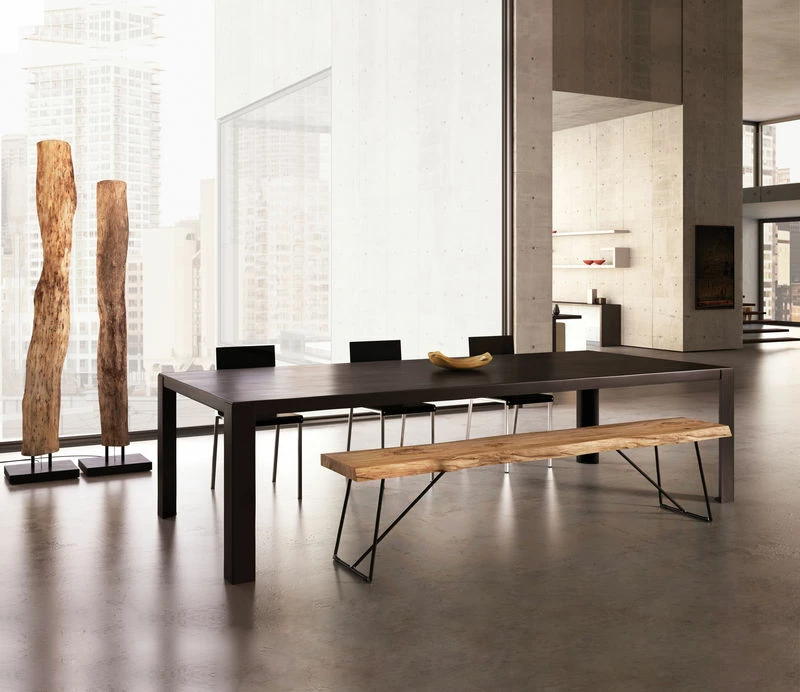 A natural feel and raw beauty for this fantastic bench that has the air of a primitive sculpture! Each item in the Old Times collection is an extraordinary, unique piece, hand-crafted from a single piece of old wood (olive tree) which is then waxed. Just two Italian cabinetmakers work on making the Old Times collection, which requires exceptional craftsmanship. Old Times showcases wood in its raw state: the defects which are generally glossed over here are highlighted and shown off. The knots and irregular contours of the aged solid elm seat are the ingredients of a primitive aesthetic that draws a link between present and past. This bench tells us about those ancient times when men sat on tree trunks and rocks… The minimalist design of the steel rod base superbly sets off the seat. The charisma of the Old Times bench is expressed through a mix of simplicity, modernity and authenticity.Zeus furniture is made by skilled craftsmen in Italy, near Modena. Each piece is made by hand: the metal is cut, assembled, welded and painted by hand. Each item is unique. Steel is a recyclable material and any metal scrap not used during manufacturing is recycled for re-use. Zeus furniture is built to last: highly durable, this furniture can be handed down from generation to generation.