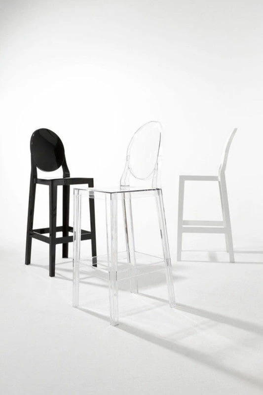 “If you want to sip a drink at the bar in peace and quiet, you need a comfortable tall stool with a back to lean against. Sometimes one drink is not enough: and you need “”One more”” and sometimes “”One more please””. The “”Ghost”” family, one of the famous Kartell icons, multiplies its ranks with stools of different heights – 65 cm of 75 cm and backs, either oval or square, but flexible, practical, coloured and resistant. The stools are single mould products with a changeable back.”