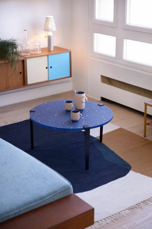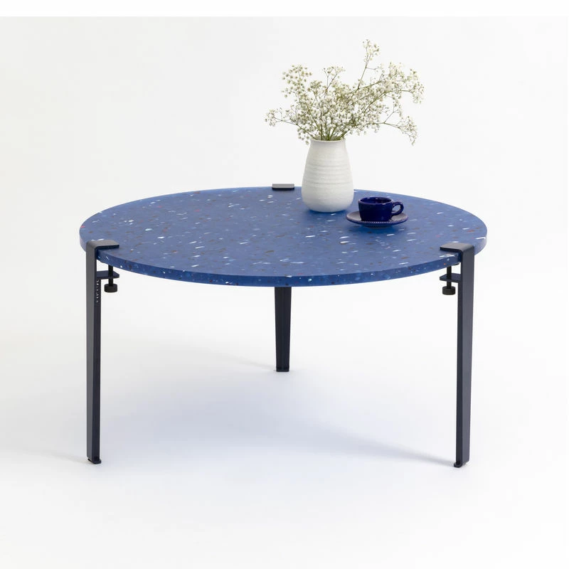 A resolutely eco-responsible table… TIPTOE’s mission is to offer sustainable furniture, better thought out and better produced. The Pacifico coffee table in recycled plastic bears witness to this: a piece that looks resolutely towards the future of furniture. This creation proves it’s possible to create objects from recycled plastic that are both beautiful, timeless and durable. Resulting from an innovative manufacturing process, the Pacifico table top is made from PET plastic packaging. The plastic waste collected is reduced to chips and then pressed (without adding binder) to form the top. A mix of colour and transparency, translucent blue is dotted with bursts of colour echoing the fragile corals of the oceans. The speckled pattern also evokes terrazzo, the star material of decoration. All the nuances of this original translucent material are revealed according to the light passing through it. Each top is unique, the colour and patterns may vary, which is what makes this collection so charming. The top is combined with three powder-coated steel legs in Mineral blue colour. The feet attach to the top easily without tools thanks to their vice system. The aim of this creation is to reverse the initial lifespan of the material. We go from a product used for an extremely short, ephemeral period (yoghurt pots or packaging) to a noble, robust object. The Pacifico table stands the test of time and is designed to be functional for several generations!It’s a circular process: we transform a pre-existing raw material, which itself can be recycled again at the end of its life. Going beyond recycling, Pacifico is an exceptional piece that makes you completely forget the primary function of plastic. The Pacifico table is 100% produced in Europe and France.