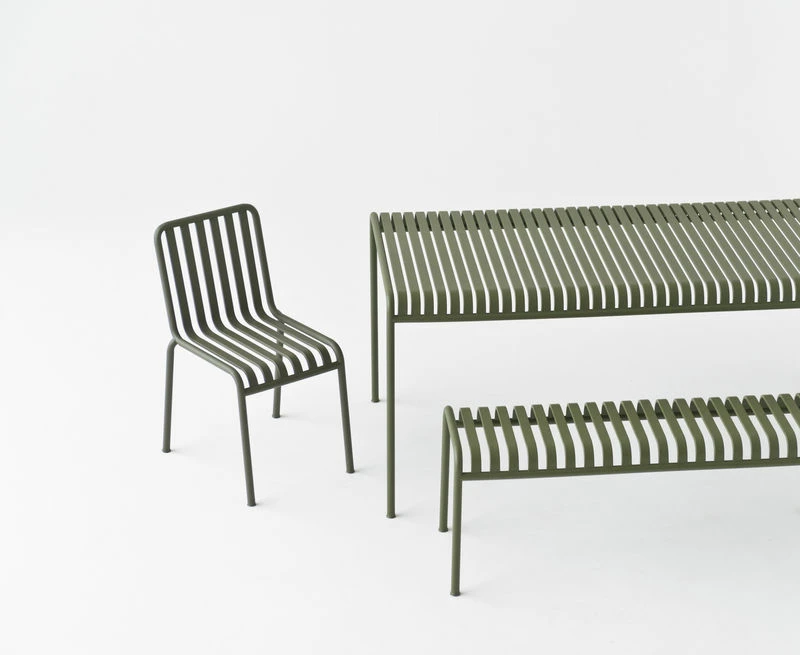 Palissade is a complete collection of outdoor furniture. The collection designed by Ronan & Erwan Bouroullec ranges from tables and benches over sofas to dining and lounge chairs. The 13 elements in the collection are made from electro-galvanized powder coated steel and will be available in light grey, anthracite and olive.