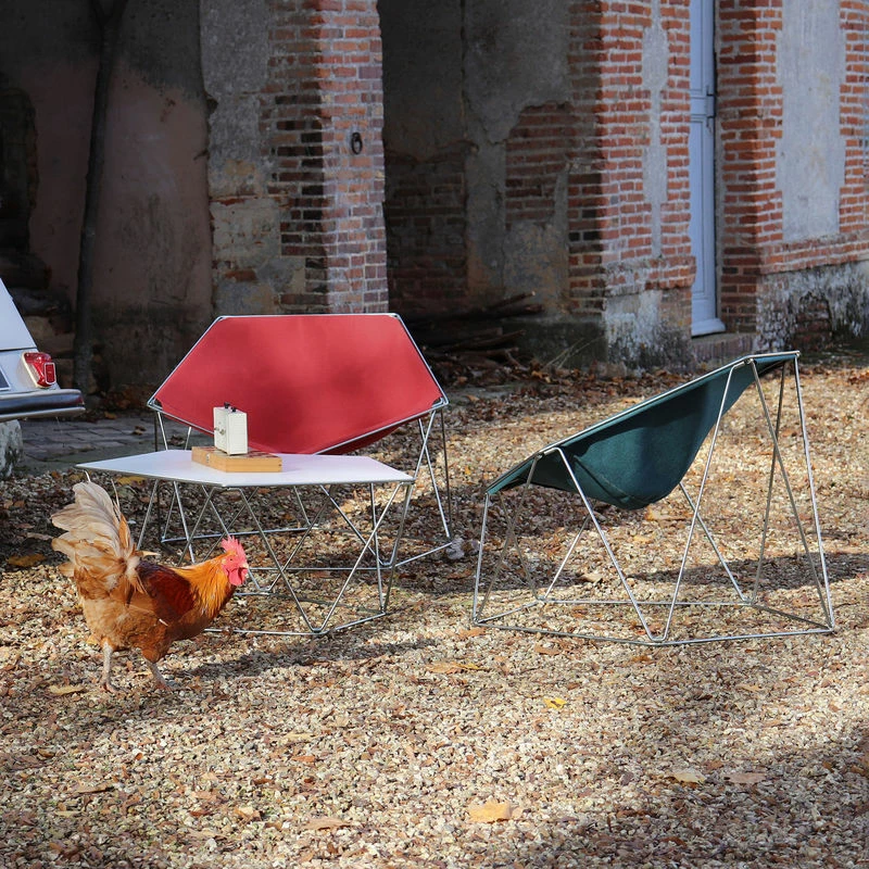 La gamme Penta ou comment faire rentrer un salon dans une 2 CV ! Ă lâorigine de ce projet datant de 1970, un pari des designers Jean-Paul Barray et Kim Moltzer : faire entrer dans le coffre dâune 2 CV CitroĂ«n quatre fauteuils et une table basse pour un pique-nique en plein air. DĂ©montable et pliable, la gamme Penta se veut donc nomade et sâadapte aussi aux petits espaces intĂ©rieurs. Comme certaines architectures (pensons au « less is more » de Mies van der Rohe), la gĂ©omĂ©trie du Penta ne se laisse influencer par aucune tendance, par aucune Ă©poque. Ainsi, par le dessin alliĂ© Ă lâingĂ©niositĂ© et Ă la rĂ©ponse technique, le Penta est devenu un classique du design, et depuis des annĂ©es inscrit au fond de la collection du Centre Georges Pompidou. Ces meubles sont adaptĂ©s aux exigences et problĂ©matiques actuelles dâĂ©co-conception, rationnalisant lâespace mais Ă©galement le volume de livraison et les matĂ©riaux (tissu, plateau lĂ©ger et fil dâacier uniquement). ImaginĂ©s autour dâun jeu gĂ©omĂ©trique permettant la rĂ©partition de la tension et des charges, le fauteuil Penta ne pĂšse que 5,6 kg â et la table Penta encore moins (5 kg). Si la gamme originale Ă©tait fabriquĂ©e par la cĂ©lĂšbre entreprise Caddie, cette réédition respecte toujours la volontĂ© des designers dâune fabrication ââfait mainââ et 100% Made in France, toujours gage dâune qualitĂ© Ă trĂšs long terme, y compris en extĂ©rieur. RĂ©fĂ©rent pour les amateurs de design du XXĂšme siĂšcle, sa durabilitĂ© et sa soliditĂ© confĂšrent au Penta une valeur de ââ transmission intergĂ©nĂ©rationnelleââ.