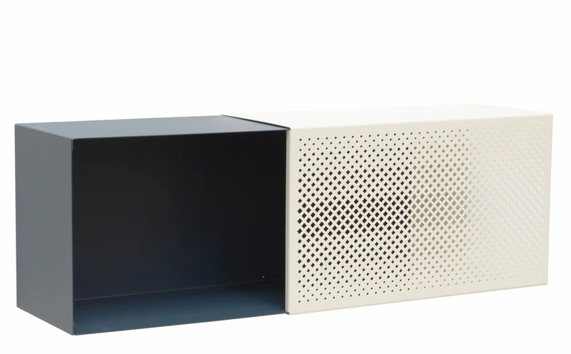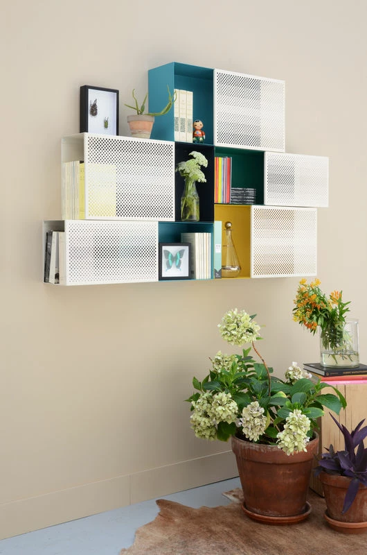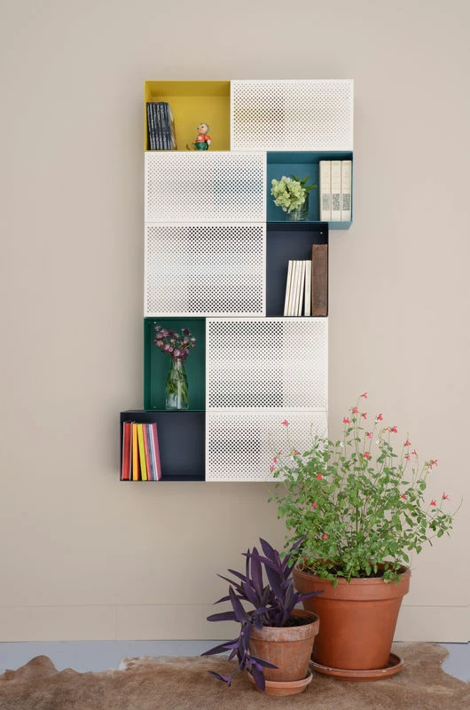 Halfway between rack and shelf, each Perfo unit consists of two fixed parts: one sheet lacquered, full and colorful, the other in micro-perforated beige sheet. Each part of one unit provides different storage principles. The solid part, open in front allows direct exposure on a colored background. The micro-perforated section, open on the side, provides a more intimate storage: the perforated layer partially hides the content. Closely, the micro-perforation provides a graphical and delicate pattern. By far, it produces an astonishing optical effect, ethereal and vibratory! Gay and dynamic, Perfo storage system looks great in any room of the house. Combinable and functional, it will adjust according to all your needs.
