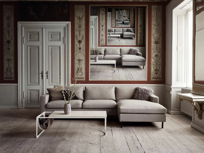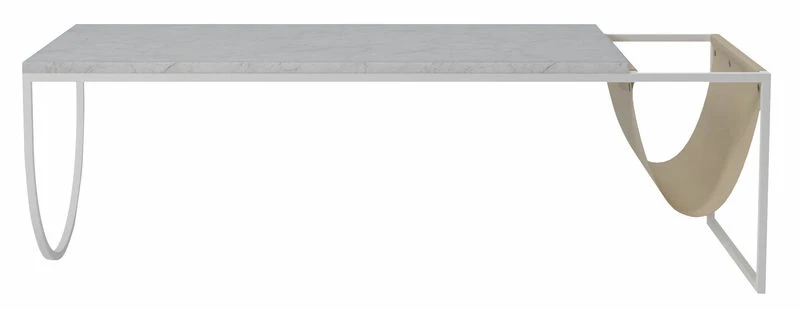 A marble top combined with a steel frame and a leather pocket for storing magazines. The coffee table, designed by German Joa Herrenknecht, is packed with great contrasts and material details. The leather pocket is created for storing magazines and books, and adds a fresh new angle to this functional coffee table. The steel frame is square at one end and curved at the other – an unexpected and unusual design detail.