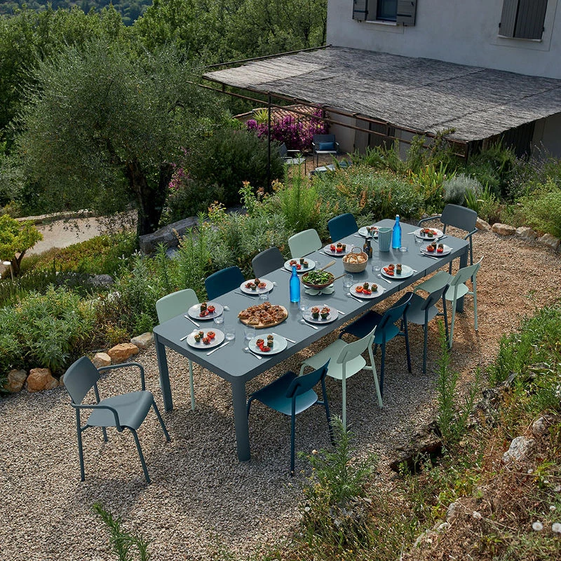 Ribambelle is an ample extending table in XXL size. It is robust, practical and adjustable. Made completely from aluminium, it is happy both outdoors and inside. Able to accommodate up to 14 people, it will be the ideal partner to enjoy moments together among friends or family. The 3 central extension leaves are completely built into the structure of the table for perfect aesthetics. Thanks to a telescopic system on bearings, extending becomes simple and fluid. When they’re not being used, the extension leaves disappear discretely, cleverly stored in a storage box located under the top. With its timeless, clean design, Ribambelle fits into all styles and combines with any Fermob chairs. Combine the shapes and colours to give it all a dynamic, unique appeal! Made using a process and technology which meets the highest requirements in terms of quality, Fermob products are fully conceived in the spirit of Made in France, and that is nowhere more evident than the location of the factory in Thoissey.