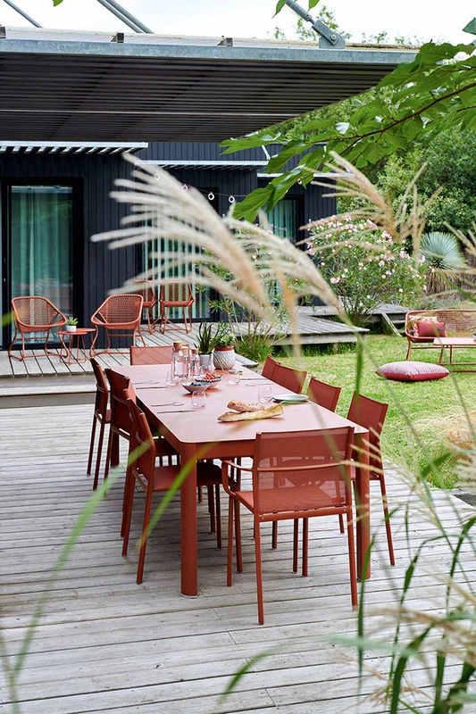 Ribambelle is a large, robust, practical and adjustable extending table. Made completely from aluminium, it is happy both outdoors and inside. Able to accommodate up to 8 people, it will be the ideal partner to enjoy moments together among friends or family. The central extension leaf is completely built into the structure of the table for perfect aesthetics. Thanks to a telescopic system on bearings, extending becomes simple and fluid. When it is not being used, the extension leaf is discrete, cleverly stored in a storage box located under the top. With its timeless, clean design, Ribambelle fits into all styles and combines with any Fermob chair. Combine the shapes and colours to give it all a dynamic, unique appeal! Made using a process and technology which meets the highest requirements in terms of quality, Fermob products are fully conceived in the spirit of Made in France and that is nowhere more evident than the location of the factory in Thoissey.