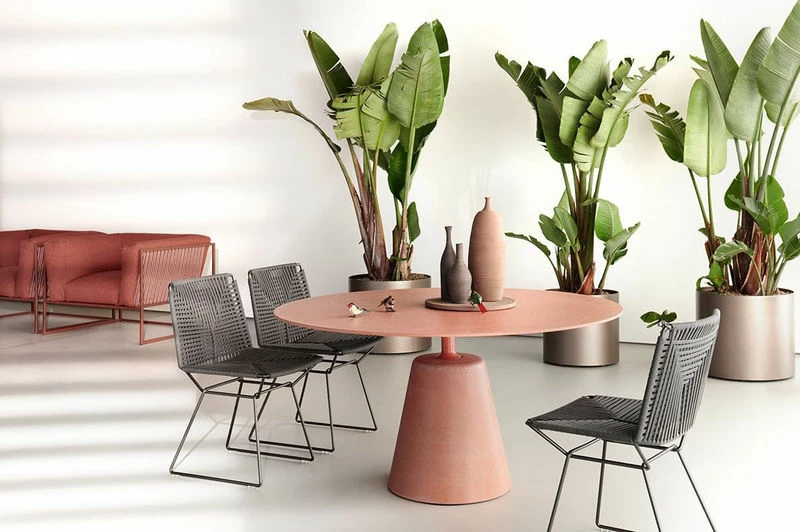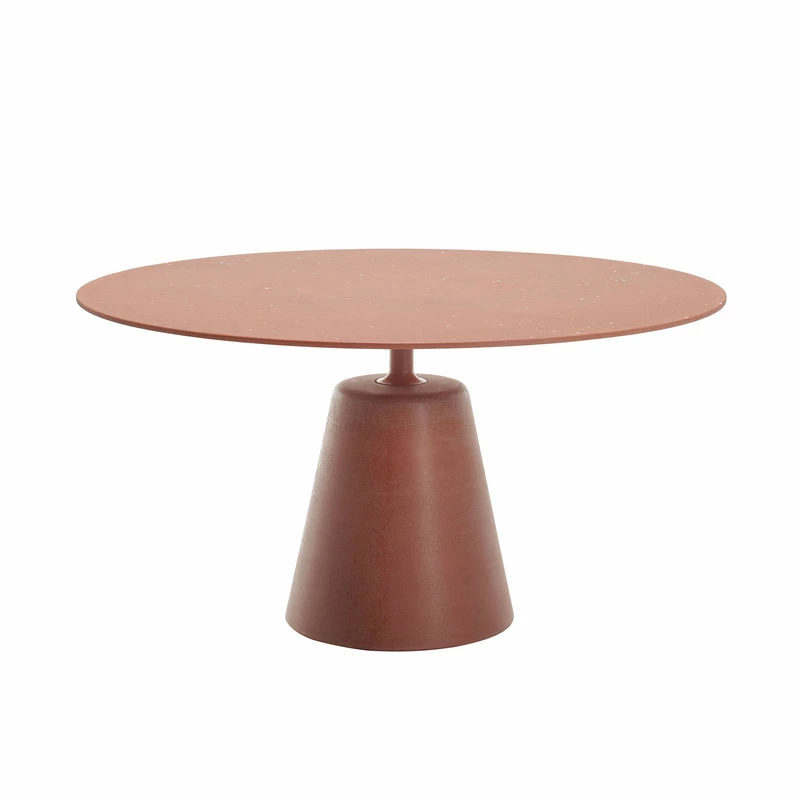 The iconic Rock table by Jean-Marie Massaud is getting an update with this outdoor version, made entirely from concrete. The top has an original mottled look which is reminiscent of Terrazzo. This mottled effect is obtained by combining concrete with fragments of Alpine stones (green version) or stones coming from Tuscany (Terracotta version). The base of the table is made from smooth solid concrete. The Rock table is characterised by its fluid and elegant silhouette which combines solid shapes with fine and delicate lines. The top seems to be floating above the solid concrete base. We love the raw and natural beauty of this industrial material. The extremely well-designed steel join between the base and the top provides a lightness and incredible fluidity to the piece. Rock is a mix of refinement and solidity, lightness and stability, radicalness and sensuality. This table is made from high-performance fibre-reinforced concrete . The colouring of the concrete is achieved via a clever combination of sand and natural elements. The concrete is then subject to slow drying. This manufacturing process causes different colour and surface shades to vary from one model to the next depending on the dose of dyes and the weather conditions during the drying: each item is unique. This irregular and raw finish gives the concrete all its industrial character.