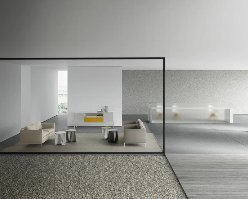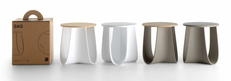 Either stool or table, outdoor or indoor: Sag represents a polyhedral and functional complement. Stool's legs are usually designed with “column” elements. On the contrary, Sag has been designed as a whole piece folded on itself, as a fabric suspended in the air and melted in three directions into a single shape. Its concave arc structure, thus generated, gives Sag its special soft and elastic image, but also an incredible sturdiness, capable of distributing forces and absorb loads.