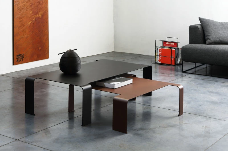 The Spin collection includes two steel coffee tables of different dimensions that can be stacked to form a graphic whole. These coffee tables are characterised by the asymmetrical arrangement of the legs which brings character and originality to the silhouette. The sheet steel structure is very fine and ultra-ethereal. With their sleek aesthetic and timeless nature, these coffee tables fit into modern interiors just as well as more classic ones. Spin completely corresponds to the philosophy of the ZEUS brand: creating items which are simple, authentic, functional and economic. A quest for the essential achieved with total control over materials. Zeus furniture is made by skilled craftsmen in Italy, near Modena. Each piece is made by hand: the metal is cut, assembled, welded and painted by hand. Each item is unique. Steel is a recyclable material and any metal scrap not used during manufacturing is recycled for re-use. Zeus furniture is built to last: highly durable, this furniture can be handed down from generation to generation.