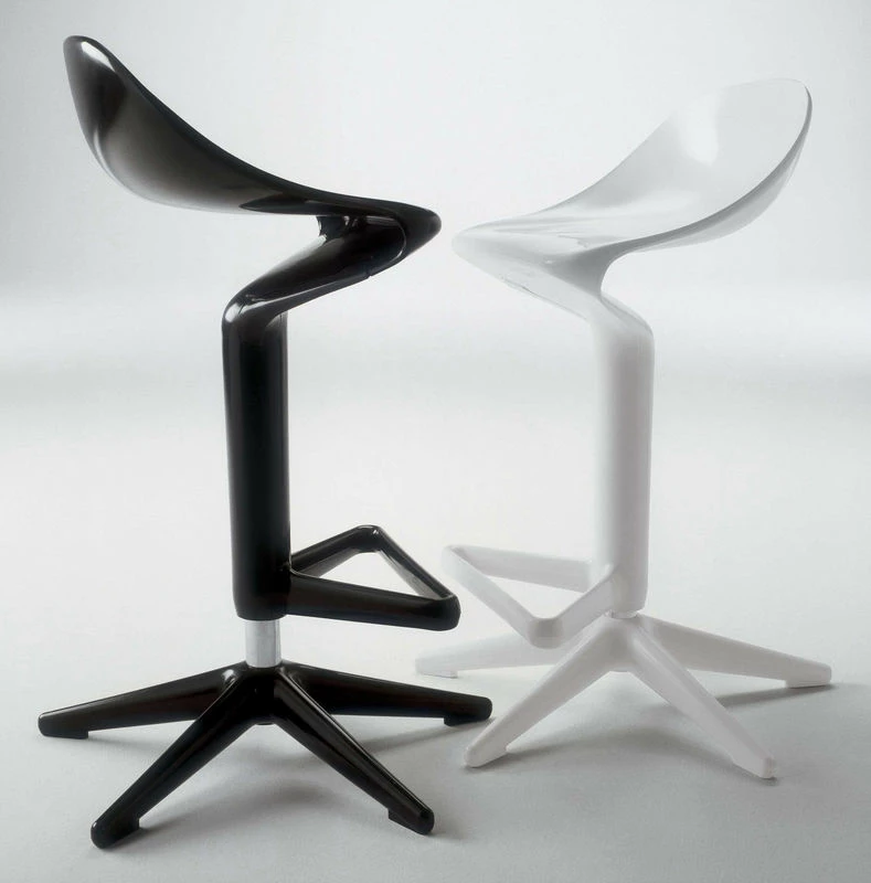A revolutionary project of stool whose curvy, slinky shape is reminiscent of silhouette of a spoon. The Spoon innovation consists of the connection between the seat and the central leg by means of an elastic curve able to offer flexibility, confort and resistance to the weight supported. The clean line of the overall design is preserved : the handle that controls the mechanism of the gas pump is introduced inside the leg, not visible. A real touch of class given by kartell technology, which reveals the great attention given not only to the functionality but also to its formal elegance.