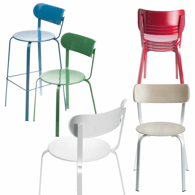 With Stil, Patrick Norguet confirms its permanent research design simple and obvious. STIL is the result of a strict cooperation between industrial know-how and the designer.Optimization and the use of modern technology, gave the possibility of a development of a light Chair and stool visibly harmonic proportions. Stil is stacking, steel, various colours, also available with seat and back on solid wood comfort rear seats have a special charm.