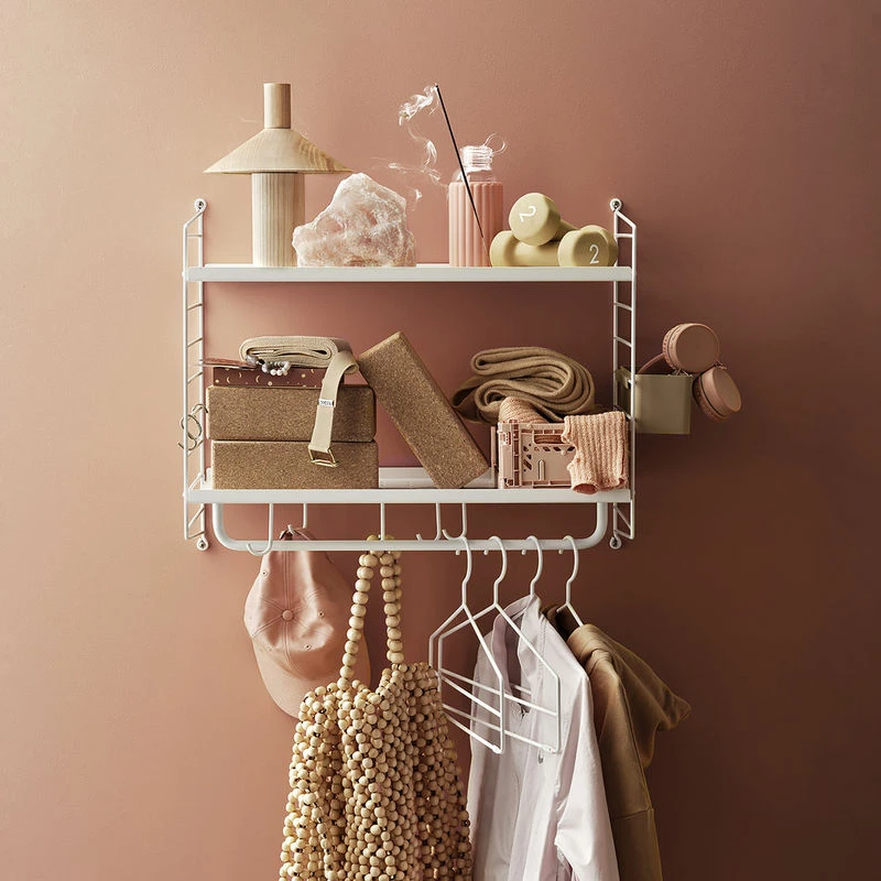A Scandinavian design icon! The String shelving system was designed in 1949 by Swedish architect Nils Strinning (1917-2006), a leading figure in Scandinavian design. String is a system of modular shelves that can be combined depending on your needs. It is light, adaptable and offers a minimalist, timeless design, all of which have made it a Swedish design classic. The String shelf is still manufactured in Sweden according to high quality standards. Its design has not changed since 1949. Completely dismountable, this String Hallway wall shelving has been designed especially for entrance hallways, corridors, bedrooms or dressing rooms, etc. It brings together a multitude of essential accessories into a single, compact piece of furniture. String Hallway is composed of two uprights in white metal wire (H 50 x D 30 cm) in which two white metal shelves with low sides are inserted (L 58 x D 30 cm). It includes the following elements: a beige bio-plastic wall trinket dish (20 x 8 x H 8 cm), a white rail (L 58 cm), four white coat hooks, five white J-hooks and two stainless steel S-hooks. Delivered disassembled. Maximum load : 25 kg distributed evenly across the piece.