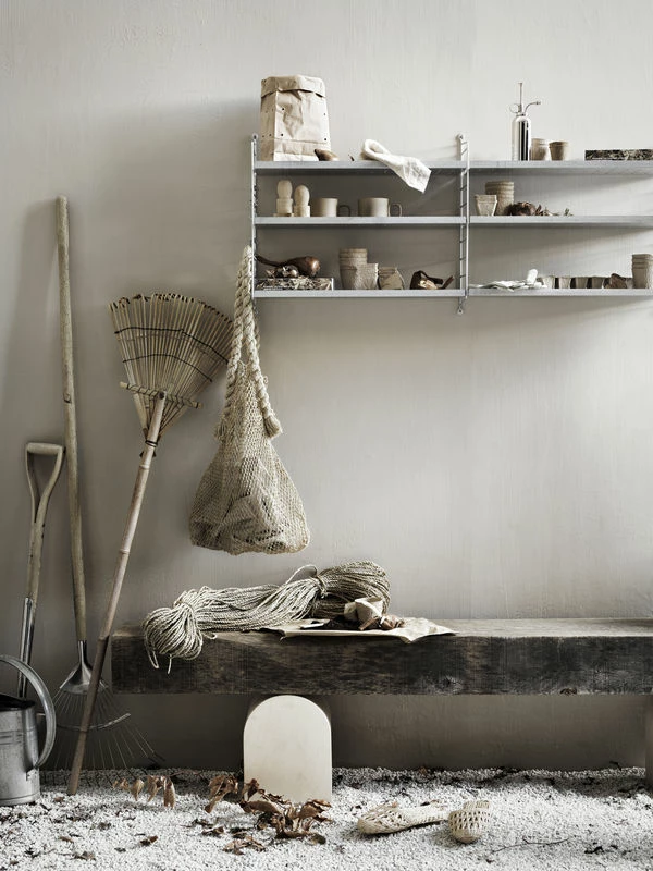 An icon of Scandinavian design for our gardens and terraces! Designed in 1949, the famous modular String shelf is now available in a galvanised steel version suitable for outdoor use. Perfectly weatherproof, it does not rust. Its raw, industrial look is also perfect for creating a loft decor inside. The shelves are made of aluzinc, a steel coated with zinc-aluminium, which is ultra-resistant to mould and corrosion. The lateral uprights are made of galvanised steel. The perforated shelves allow water to drain away. These shelves are perfect for holding flower pots and creating a trendy nature area. Aromatic plants, colourful flowers, a cactus collection: let your imagination run wild to dress this refined structure as you wish. String shelving is also perfect for storing gardening tools, watering cans, baskets and lanterns … The String shelf system is totally modular. All elements (uprights, shelves) are sold separately and very easily assembled. The shelves fit easily into the side pillars without the use of tools. The shelves are adjustable in height. To make your String composition, just buy at least 2 side uprights. You can choose between floor (ground) and wall uprights. If you want to expand your shelf, you can add a third upright or more. This perforated metal shelf has a high edge (H 7 cm). It is suitable for lateral uprights with a depth of 30 cm.