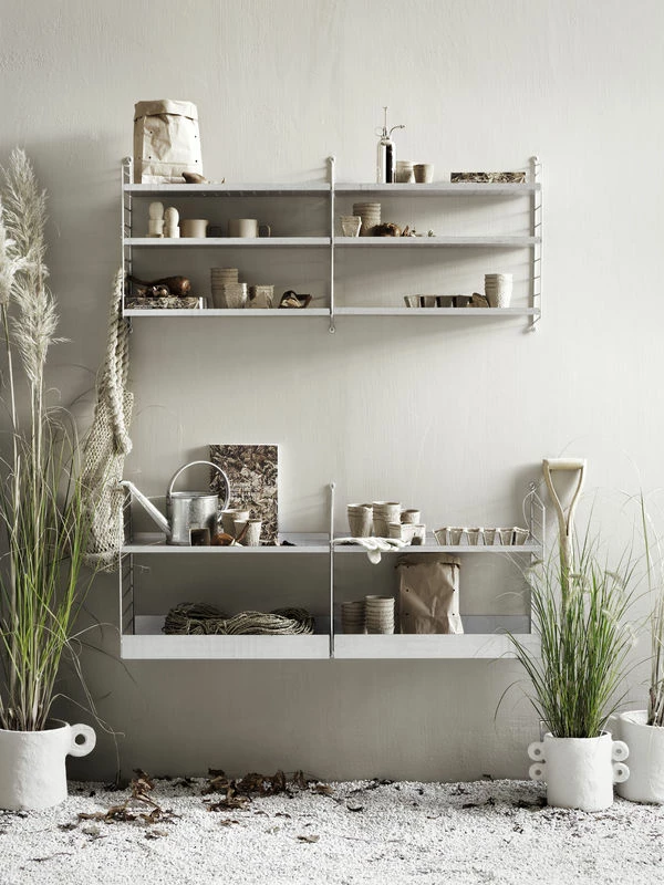 An icon of Scandinavian design for our gardens and terraces! Designed in 1949, the famous modular String shelf is now available in a galvanised steel version suitable for outdoor use. Perfectly weatherproof, it does not rust. Its raw, industrial look is also perfect for creating a loft decor inside. The shelves are made of aluzinc, a steel coated with zinc-aluminium, which is ultra-resistant to mould and corrosion. The lateral uprights are made of galvanised steel. The perforated shelves allow water to drain away. These shelves are perfect for holding flower pots and creating a trendy nature area. Aromatic plants, colourful flowers, a cactus collection: let your imagination run wild to dress this refined structure as you wish. String shelving is also perfect for storing gardening tools, watering cans, baskets and lanterns … The String shelf system is totally modular. All elements (uprights, shelves) are sold separately and very easily assembled. The shelves fit easily into the side pillars without the use of tools. The shelves are adjustable in height. To make your String composition, just buy at least 2 side uprights. You can choose between floor (ground) and wall uprights. If you want to expand your shelf, you can add a third upright or more. This set includes two wall uprights. Suitable for String shelves with a depth of 20 cm.