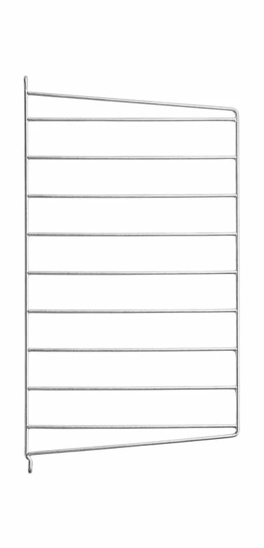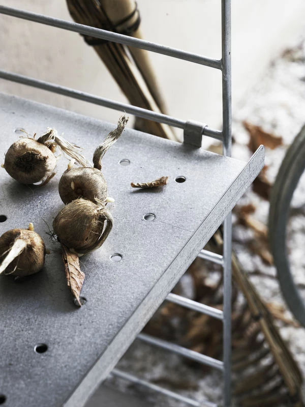 An icon of Scandinavian design for our gardens and terraces! Designed in 1949, the famous modular String shelf is now available in a galvanised steel version suitable for outdoor use. Perfectly weatherproof, it does not rust. Its raw, industrial look is also perfect for creating a loft decor inside. The shelves are made of aluzinc, a steel coated with zinc-aluminium, which is ultra-resistant to mould and corrosion. The lateral uprights are made of galvanised steel. The perforated shelves allow water to drain away. These shelves are perfect for holding flower pots and creating a trendy nature area. Aromatic plants, colourful flowers, a cactus collection: let your imagination run wild to dress this refined structure as you wish. String shelving is also perfect for storing gardening tools, watering cans, baskets and lanterns … The String shelf system is totally modular. All elements (uprights, shelves) are sold separately and very easily assembled. The shelves fit easily into the side pillars without the use of tools. The shelves are adjustable in height. To make your String composition, just buy at least 2 side uprights. You can choose between floor (ground) and wall uprights. If you want to expand your shelf, you can add a third upright or more. Contains a single wall upright Suitable for String shelves with a depth of 30 cm.