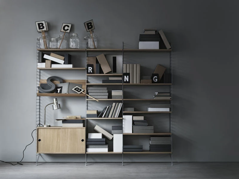 An icon of Scandinavian design! String system was designed in 1949 by Nils Strinning, a famous Swedish architect. This fully adjustable system offers you freedom to customize the look, dimensions and functions of your library. All components (wall panels, shelves, cabinets and chests) are sold separately and extremely easy to assemble. You can choose the number of panels and the number and lengths of shelves you want; you can add cabinets and/or chests of drawers… String shelf is still being produced in Sweden with an attention to quality; its design has not been changed since 1949. To put together an own String shelf is incredibly simple! Shelves, cabinets and chests can be moved freely in lateral steel panels. You have a choice between several shelf types: simple shelf (L 58 cm or L 78 cm), door-shelf (L 78 cm), 3-bowls-shelf (L 78 cm). You can also choose between cabinets with sliding doors or chests of drawers. Shelves, cabinets and chests can be assembled and disassembled very easily, no special tools needed. They can be adjusted to the desired height; steel panels are to be fixed on a wall. In order to create a String composition, it is sufficient to buy two wall panels. If you wish to extend your bookshelf, you can add a third panel. This set consists of three 78 long white-lacquered MDF shelves.