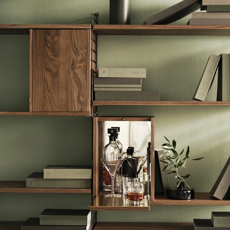 | Characteristics | Model dating back to 1949 (design icon) – Made in Sweden – Compartment with 1 drop-down door (opens at the bottom) – Compatible with all String® System plexi and grilled elements with a depth of 30 cm – The compartment fits into the String System side uprights (uprights sold separately) – This little compartment should be placed above a shelf or another String System compartment and attached to either of the uprights – Comes disassembled |