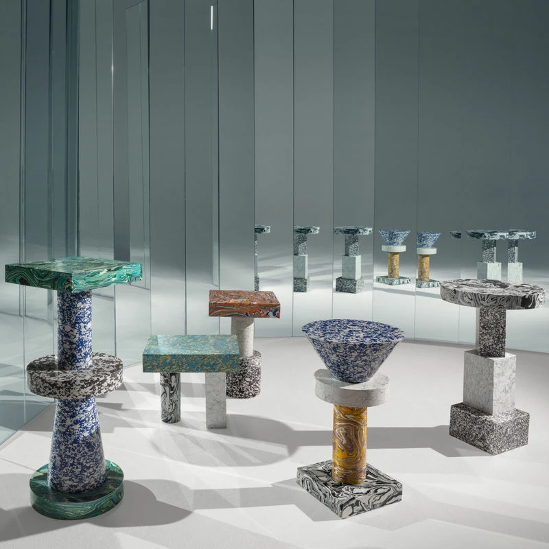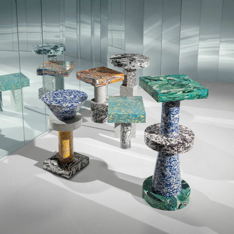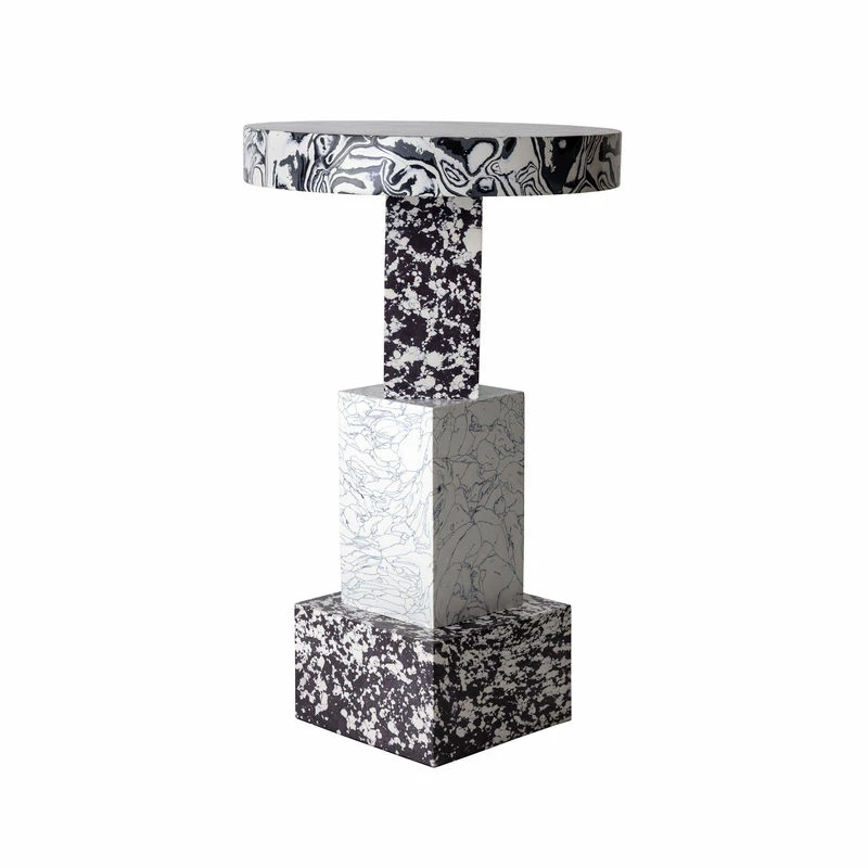 Exuberant, variegated and colourful, the Swirl side table harks back to the Italian Memphis movement, created in 1981 by Ettore Sottsass. Swirl’s pop sensibility is expressed through an asymmetrical assembly of geometric elements of various shapes, colours and prints. These disparate, stacked elements form a sculptural table, a sort of modern totem. The Swirl table is made from an innovative, mysterious material that has the look of marbled paper and the weight of stone… The famous British designer Tom Dixon pursues his artistic research inspired by post-consumer processes, the phenomenon of waste and its management, and used material recycling practices. The Swirl collection is made up of a material that imitates marble, made from industrial waste: recycled marble powder from sawmills. This powder is mixed with coloured pigments and resin. The material is then cut and turned by hand. The marble pattern provides superb mineral decoration. With its patchwork of cheerful shapes and colours, the Swirl side table injects a good dose of joy into our homes. Because of the pigmentation process, each piece has a unique pattern. A collection of tables, each with its own colouring and personality.