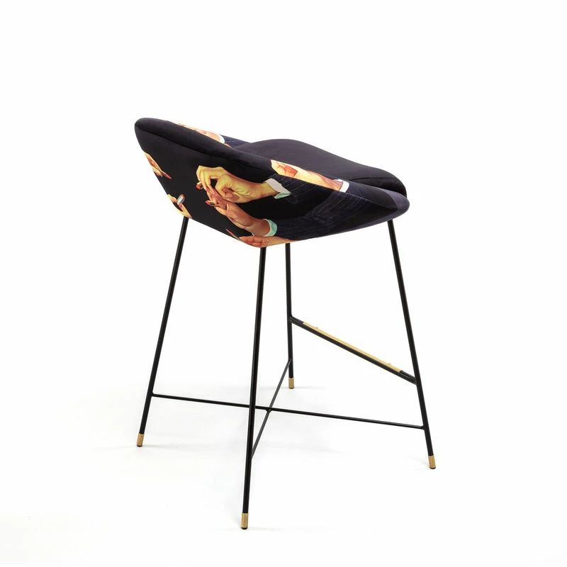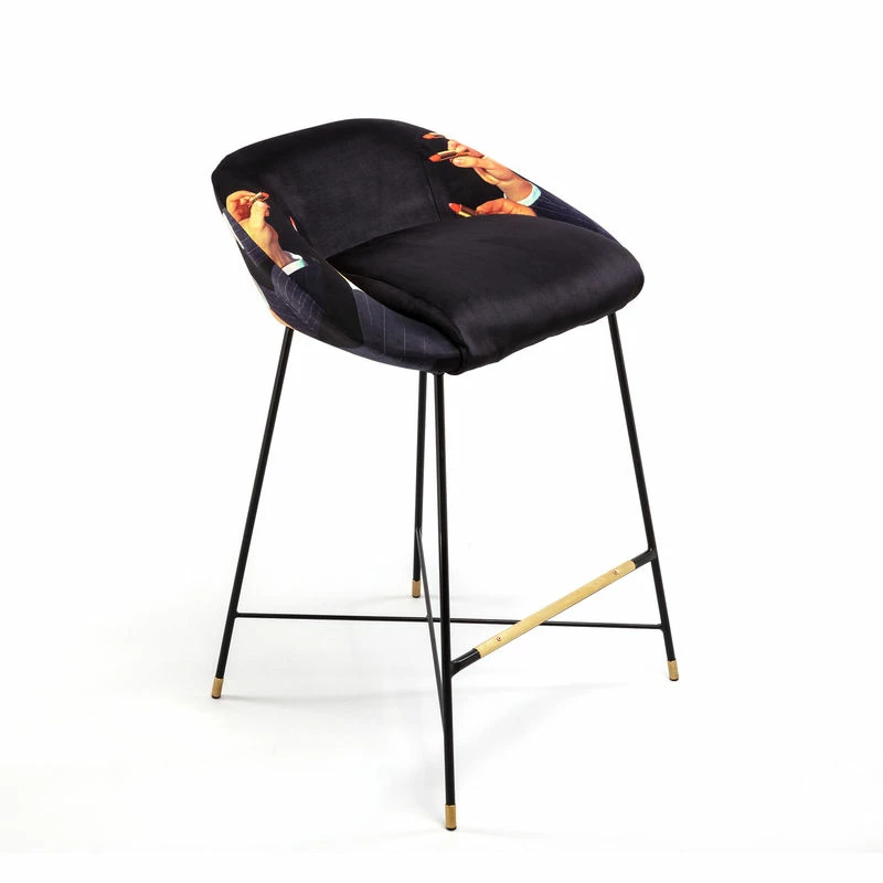It’s Maurizio Cattelan, an inescapable figure of contemporary art, and photographer Pierpaolo Ferrari who created this capsule collection for Seletti. Unlike any other, it’s provocative, amusing, absurd and eccentric all at once. The items in the collection are decorated with surrealist images taken from the Toilet Paper magazine, founded in 2010 by the two Italian artists. Perfectly manicured cut-off fingers, soap with a bite taken out of it, fish stuffed with precious gems, a canary with a cut-off wing, and more. Dreamlike Toilet Paper motifs tinged with black humour inspired by the worlds of fashion and advertising, combining commercial photography, twisted visual narratives and surreal imagery. Toilet Paper questions our contemporary obsession for images, explores our most unspeakable desires and urges. The different pieces from the Toilet Paper collection are strikingly illustrated, a mix of disturbing normality and troubling ambiguity, where dread combines with visual pleasure.A work of art in itself, the Toilet Paper collection questions, due to its affordability and wide distribution, the nature and limitations of the modern art market. This questioning has always been central to Maurizio Cattelan’s work. Retro Scandinavian lines, a bold graphic display highlighted with bright, contrasting colours … one thing’s for sure – the Lipsticks bar chair will attract everyone’s attention! With its low backrest and padded seat, it’s welcoming and very comfortable. Its velvet cover with its intense colours and gold-tinted metal legs give it a classic royal look that the illustrations counterbalance with humour.