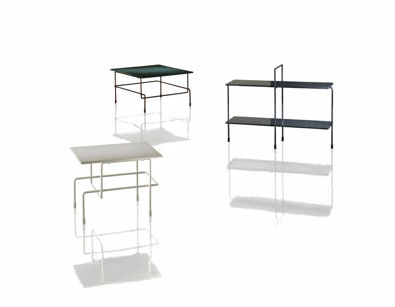 Traffic coffee table (60 x 60 cm) by Konstantin Grcic for Magis is a collection of tables with frame in steel rod, painted in polyester powder or cataphoretically-treated and painted in polyester powder. Top in acrylic stone with dressed surface.