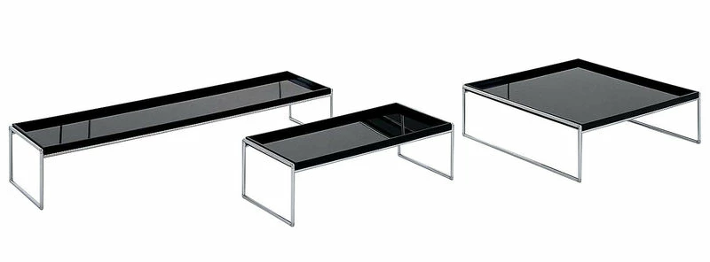 Novelties Milan 2003, Trays is a collection of tables and shelves. The trays realized in a very sophisticated methacrylate, bright black or white, suggest lacquered japanese. The chromed steel structure is worked with lightness. A very pure and elegant design signed Piero Lissoni. Coffee tables are proposed in 3 different dimensions.