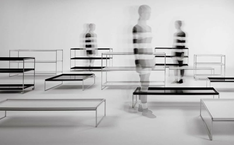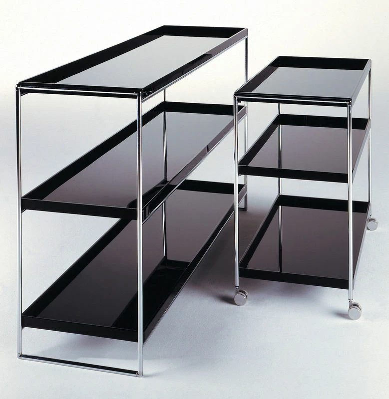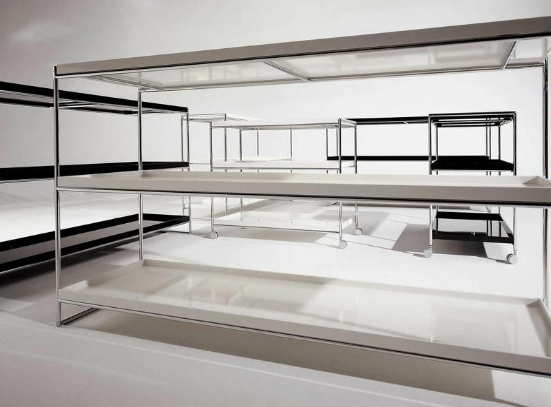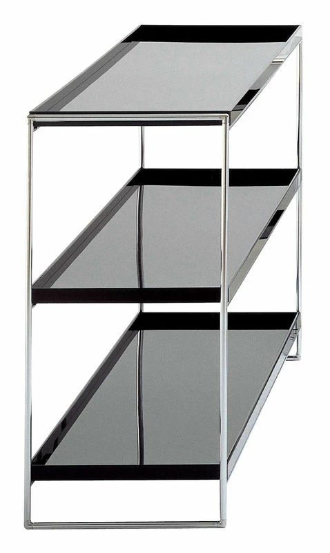 Novelties Milan 2003, Trays is a collection of tables and shelves realized in a very sophisticated méthacrylate, brilliant black or white, which bring to mind lacquered Japanese trays. The shelves are fixed to a polished aluminium structure. The design of this bookshop at 3 levels gives the impression of lightness and elegance, even though the articles are stable and robust.