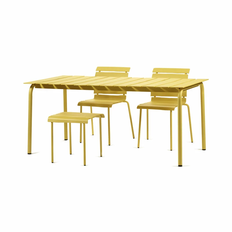 “Maarten Baas is one of the leading figures in Dutch design. Iconoclastic, subversive and brimming with fantasy, his creations sit at the crux of art and design. These are theatrical décor elements for everyday life: humorous furnishings with a rebellious edge. Through his controversial experimental work, Maarten Baas overturns preconceived ideas. He has forged his own world, happily pushing the boundaries of design to show another reality made up of strangeness, optical effects, illusion, play. After having created a tableware collection for valerie_objects, this time, Maarten Baas brings his vision of outdoor furnishings to the table, with his “Aligned” collection. This collection of outdoor tables and chairs revels in the concept of us all having an inner child, hidden away deep inside us. These creations contain a huge dose of spontaneity and naivety, translating a human touch into mechanically-produced objects. “The starting point was similar for each object that I create: creating a piece of design which is entirely functional and which appears to be hand-drawn”, declared Baas. This way, Baas redefined outdoor furnishings, which are typically composed of metal frames and wooden slats, by designing the slats with pencil on paper, then by meticulously recreating them in reality using aluminium. “You can often find beauty in just a quick sketch”, he explained. However, these spontaneous lines are also lost amidst an industrial process. This is how Maarten Baas adds organic shapes and irregular lines into a world of design centred around straight lines. “Although the underlying idea may seem simple, production is far from it”, declares Baas. “Machines are truly gifted when it comes to creating straight lines. It’s much harder to produce a twisted line”. The result is “oh-so Maarten Baas”: a design which appears to have been imagined by a child… The heat-lacquered aluminium slats contain slightly irregular and asymmetrical lines, deliberately and unapologetically imperfect. This playful and naive spirit is further reinforced by the small, forward-pointing armrests, which have an air of an outstretched arm and which give the seating a charismatic charm.”